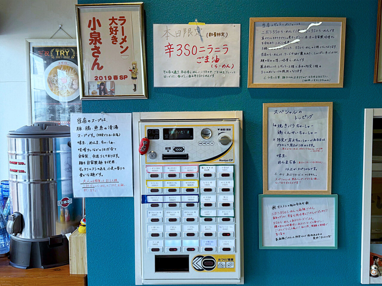 限定「辛3SOニラニラごま油らーめん」の説明が券売機上に有ります。