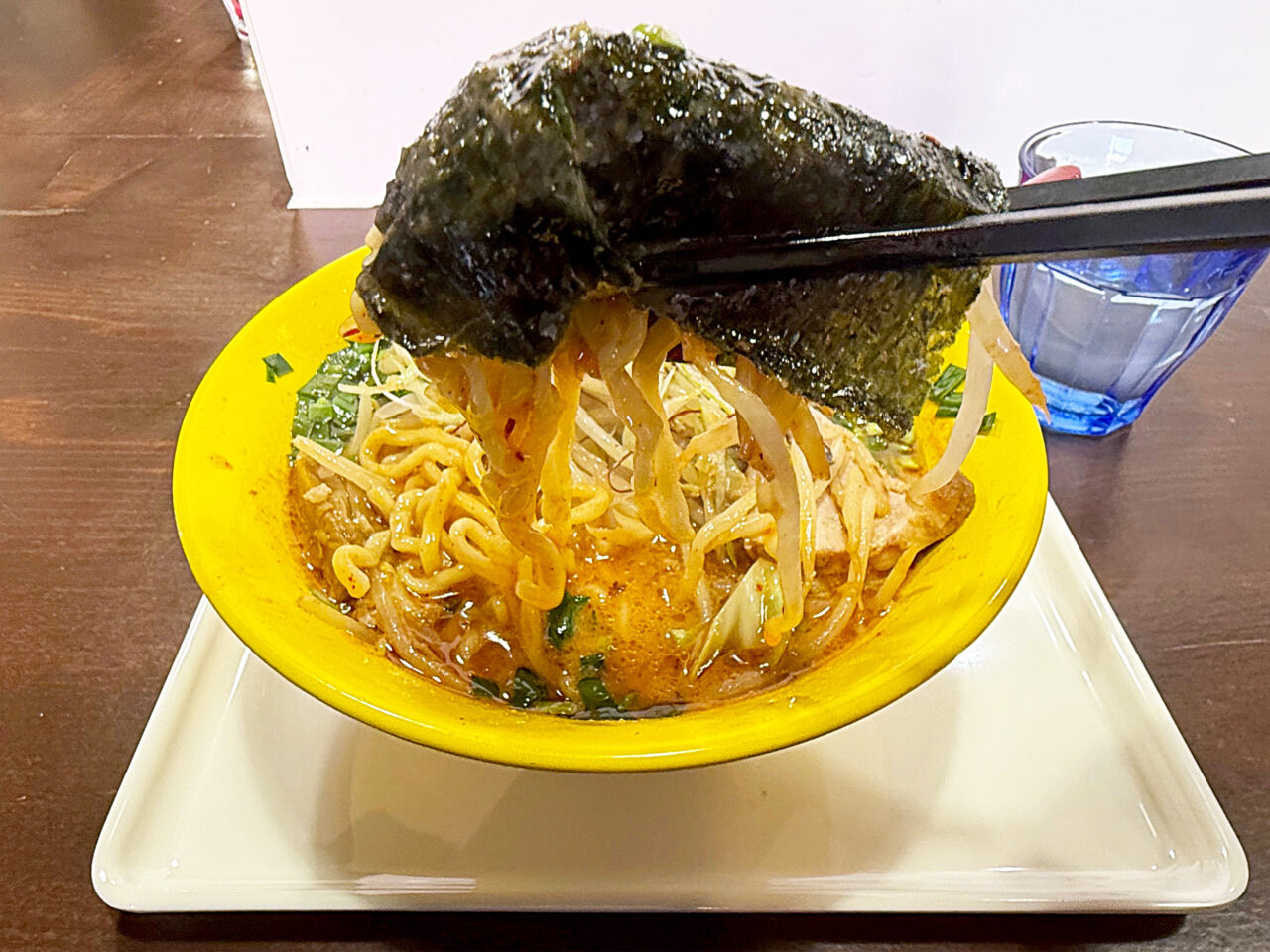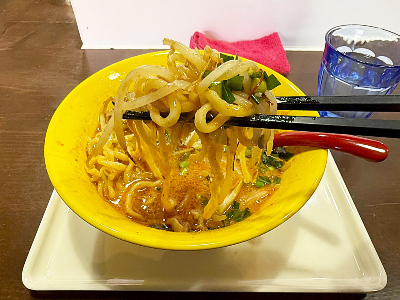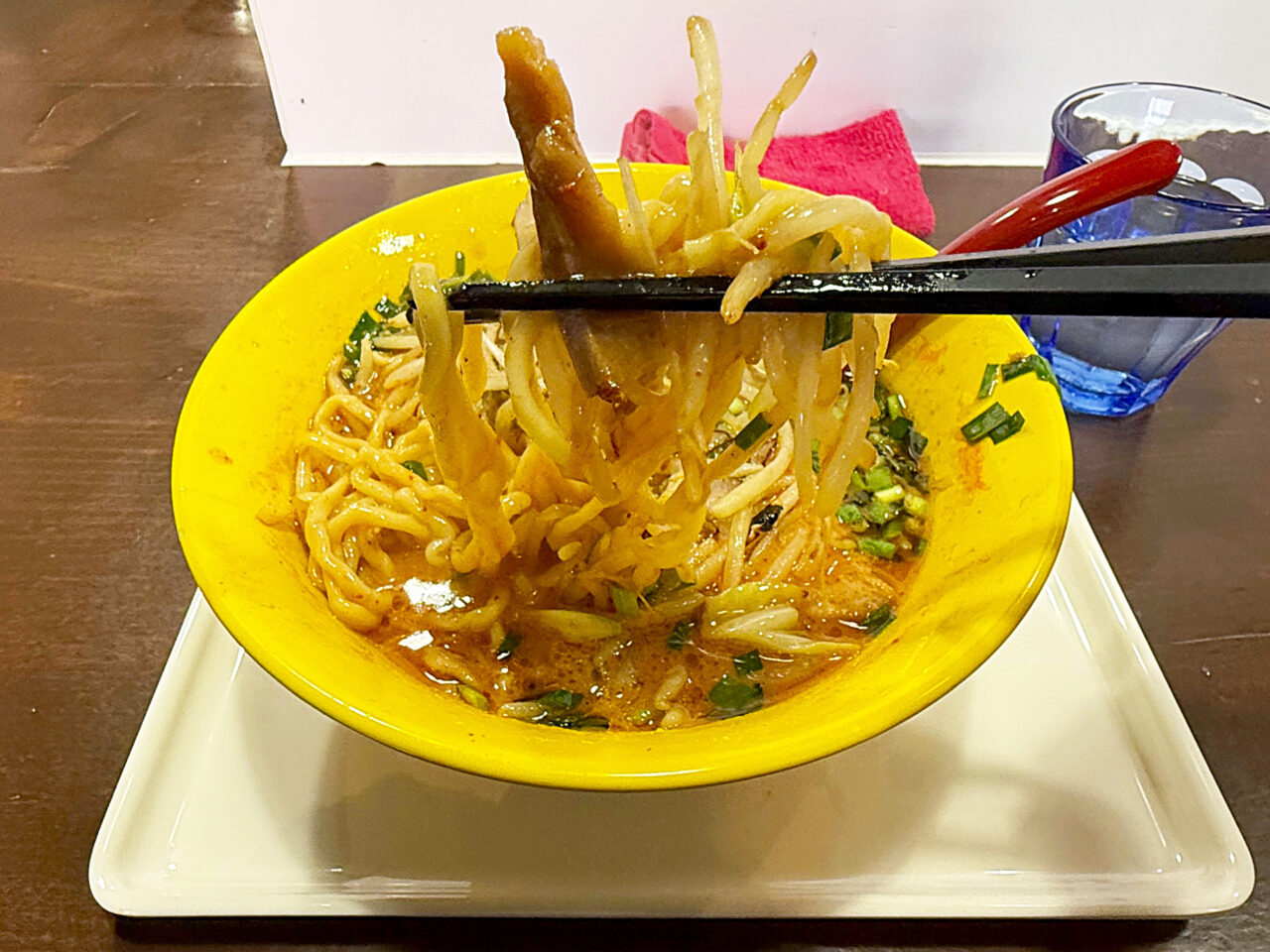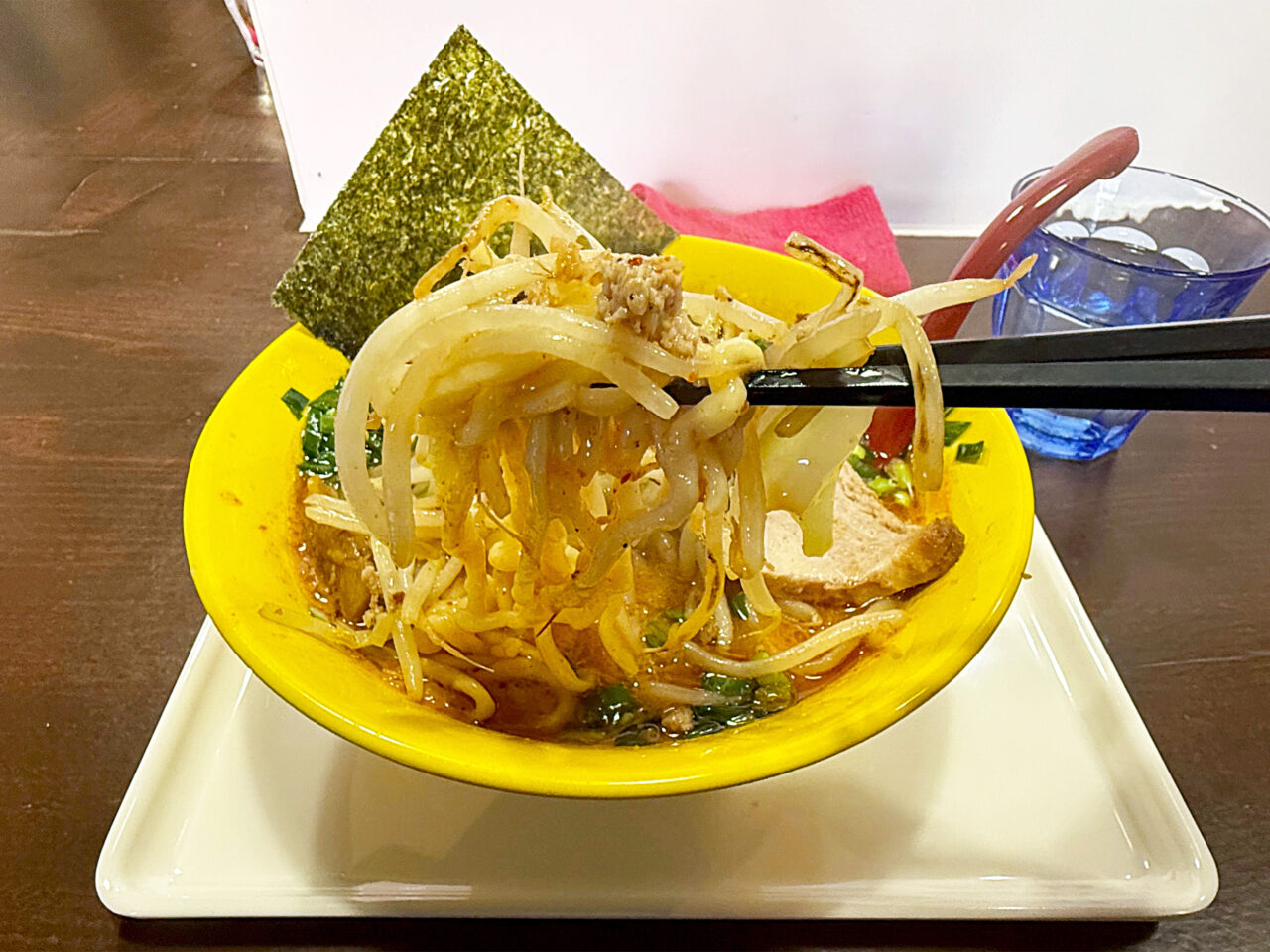 モチモチの自家製中太手もみ麺とシャキシャキで香ばしいモヤシの風味に、鶏豚スープ+味噌ダレ+ピリ辛+ニラの風味+ゴマ油の香ばしさで、とても美味しい一杯に仕上がっています。