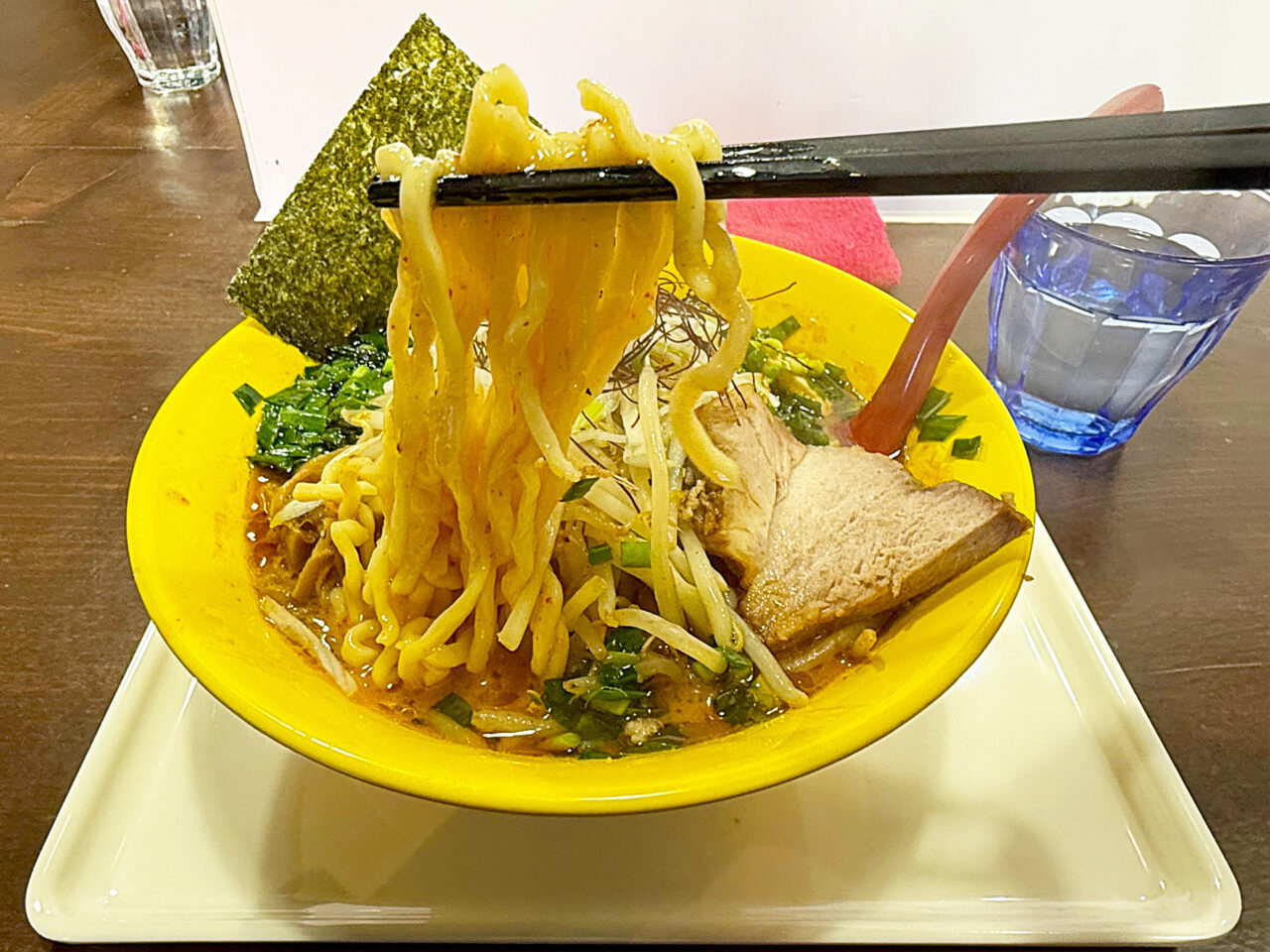 モチモチ食感の麺は「3SO」さんの「辛3SOニラニラごま油らーめん」のスープに良く合います。