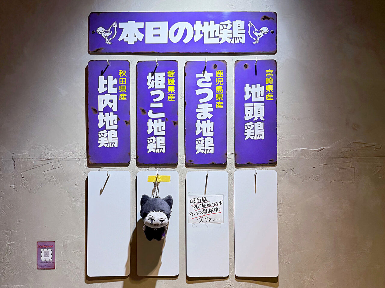 「本日の地鶏」の所にドラルクのぬいぐるみと「吸血鬼すぐ死ぬコラボラーメン提供中!スナァ…」と有ります。