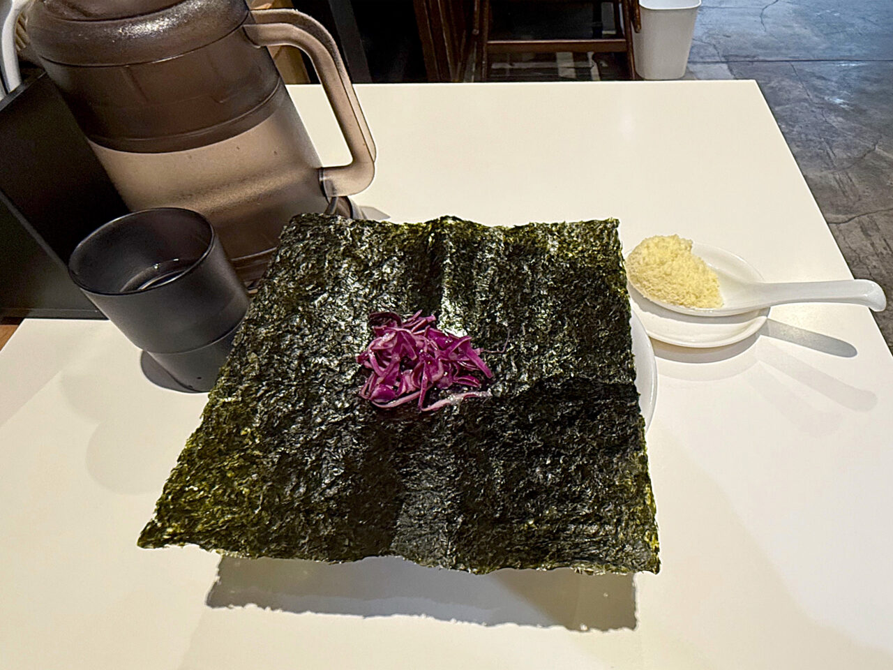 家系ラーメンの海苔の4倍ほど、手巻き寿司用の海苔の2/3位の巨大な海苔で蓋をされています。