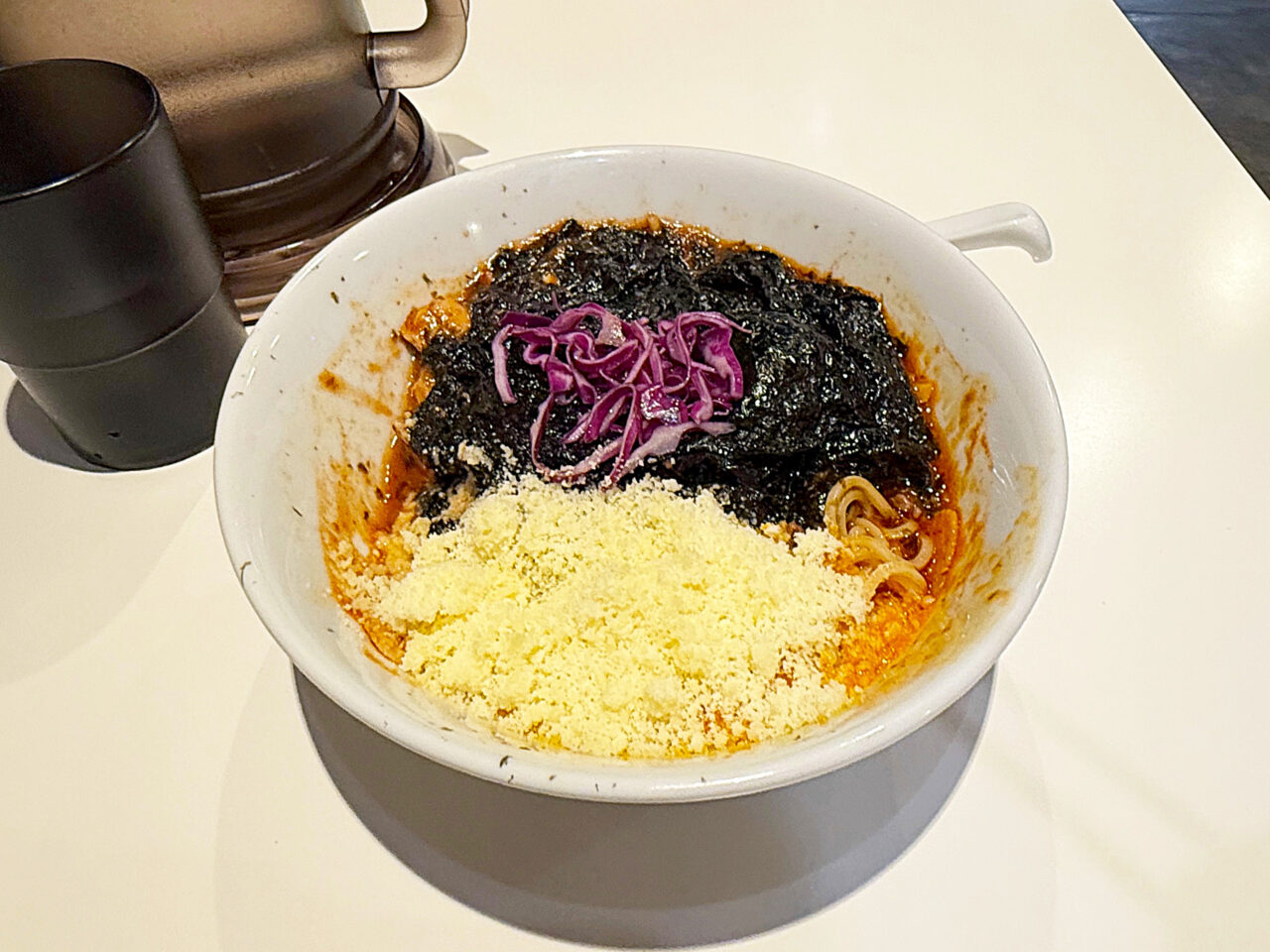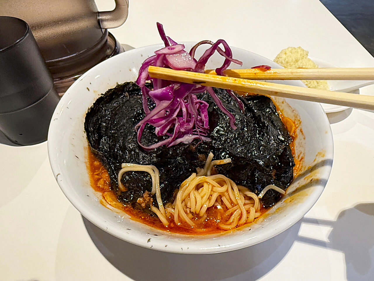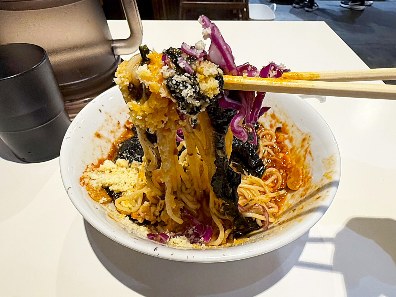 溶けて来た海苔や紫キャベツを絡めていただきます。