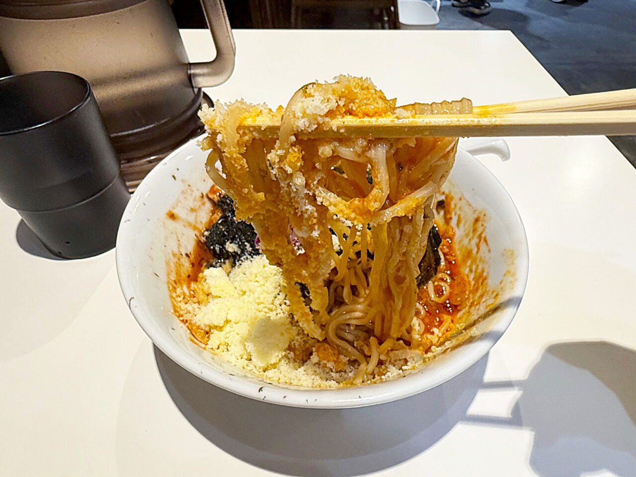 頭の中でドラルクの「スナァ…」をイメージしながら粉チーズをまぶした麺をいただきます。