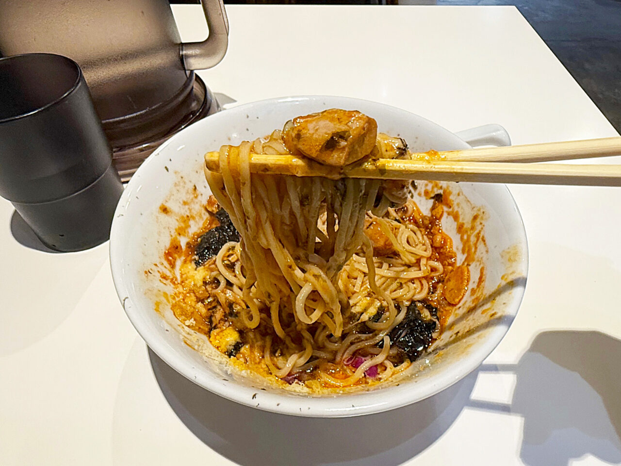 トマトスープが絡んで、赤く染まった麺も美味しそうです。