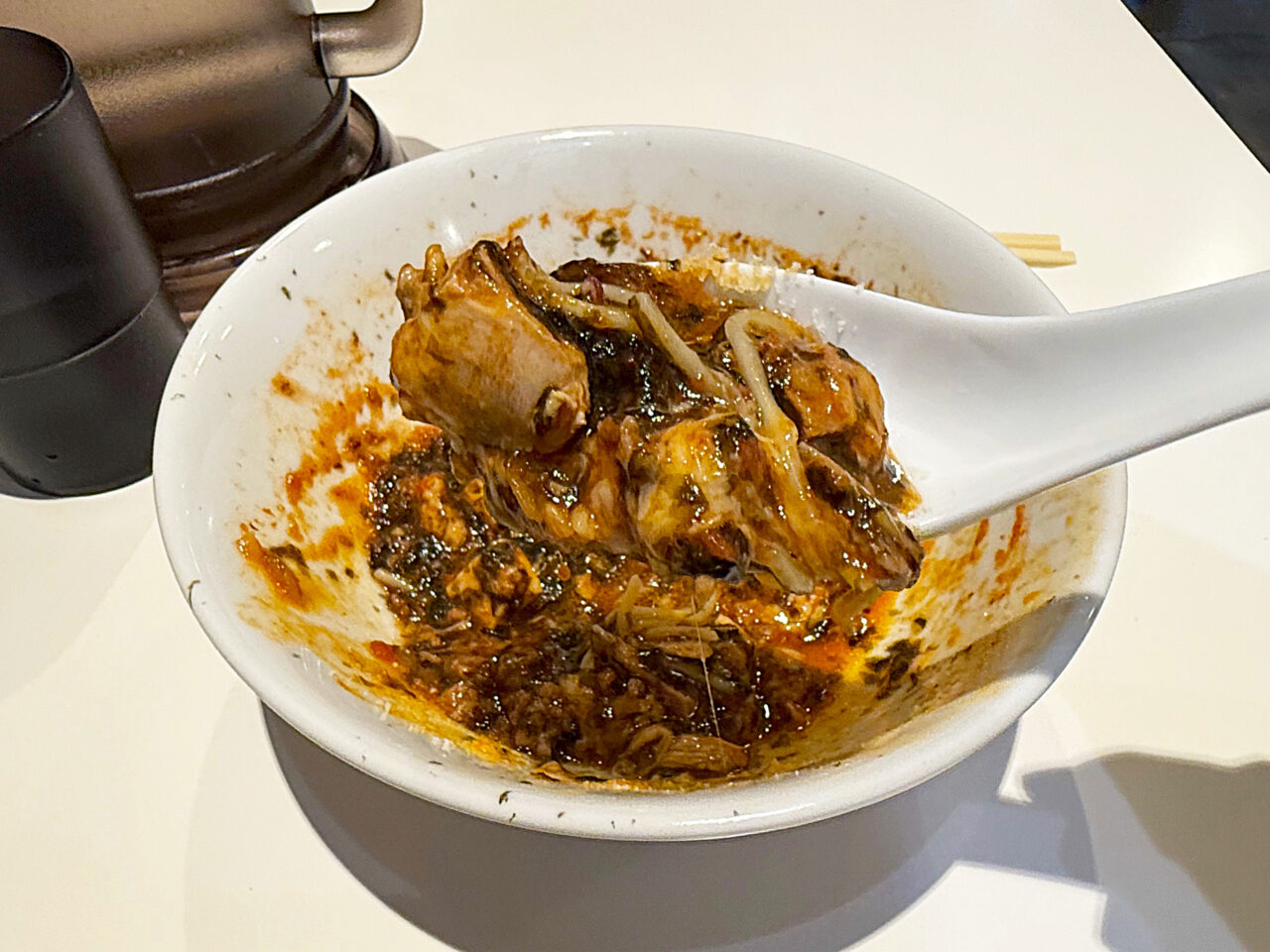 麺を食べ終えると、鶏肉と共に溶けた海苔やチーズが絡んだ具材をいただきます。