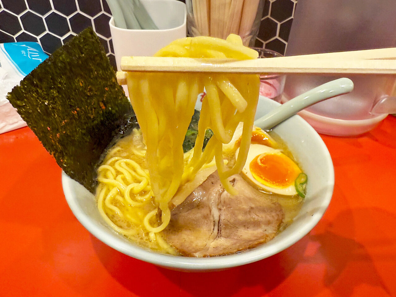 独特の味と食感の短めの麺は、すべての家系ラーメンのベンチマークとなるもので、家系スープとの相性を考えた結果だそうです。