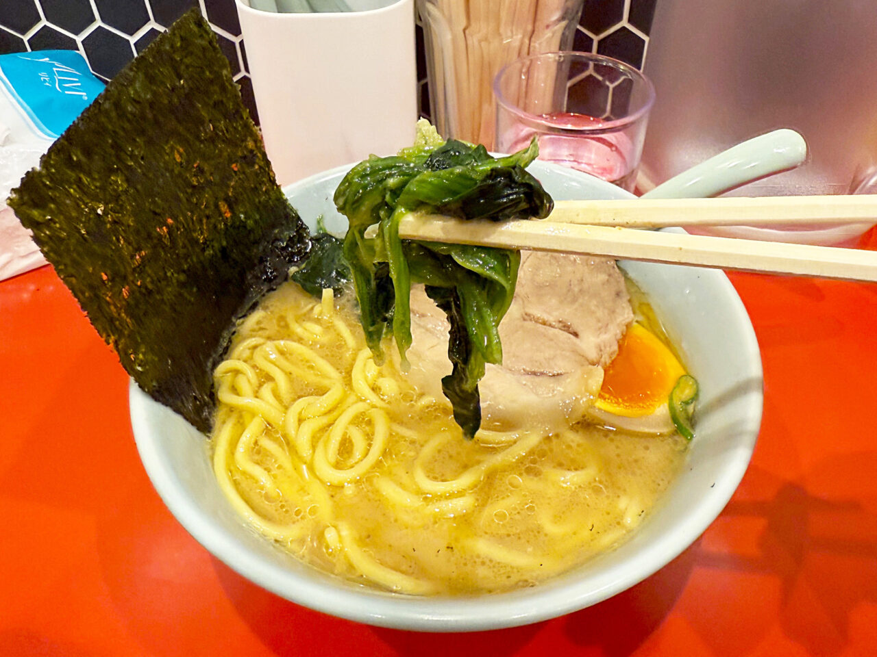 家系ラーメンの特徴でもある、ややクタ目に茹でられたほうれん草。