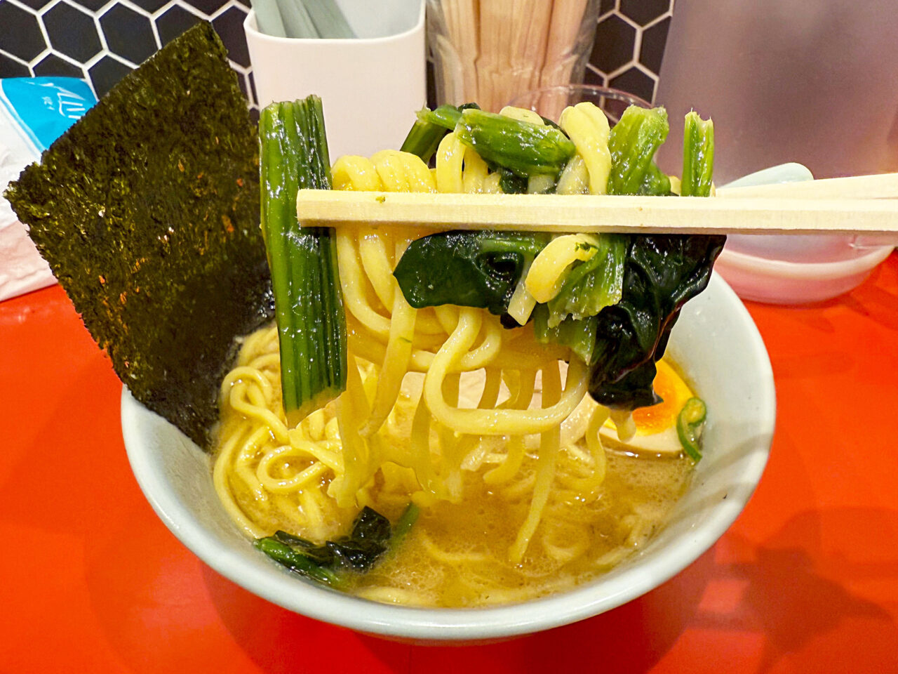 「酒井製麺」の麺をいただくと、家系スープとの相性の良さが分かります。