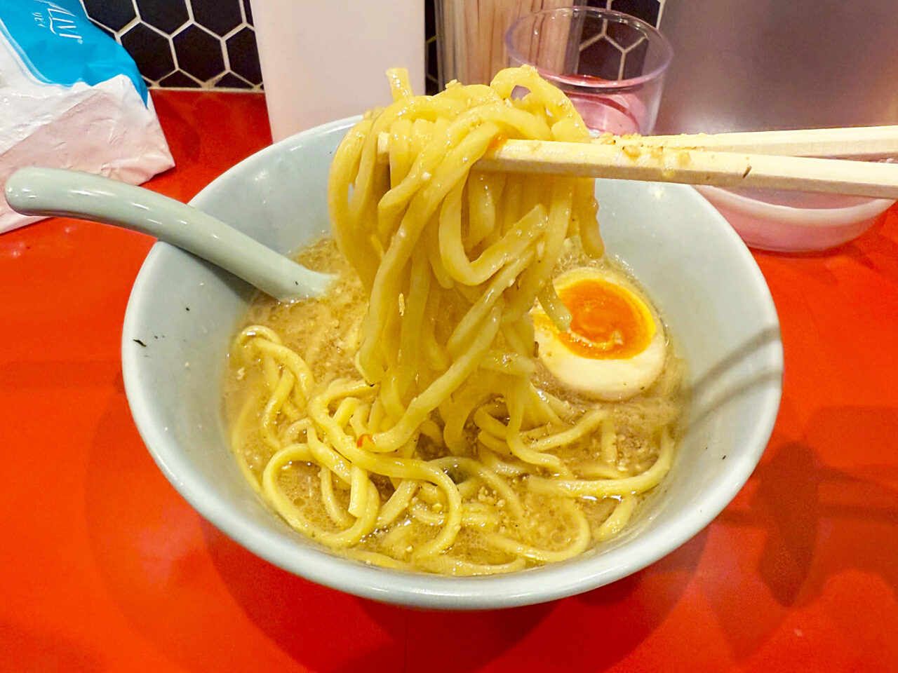 豚骨醤油のスープにニンニクと豆板醤は鉄板です。