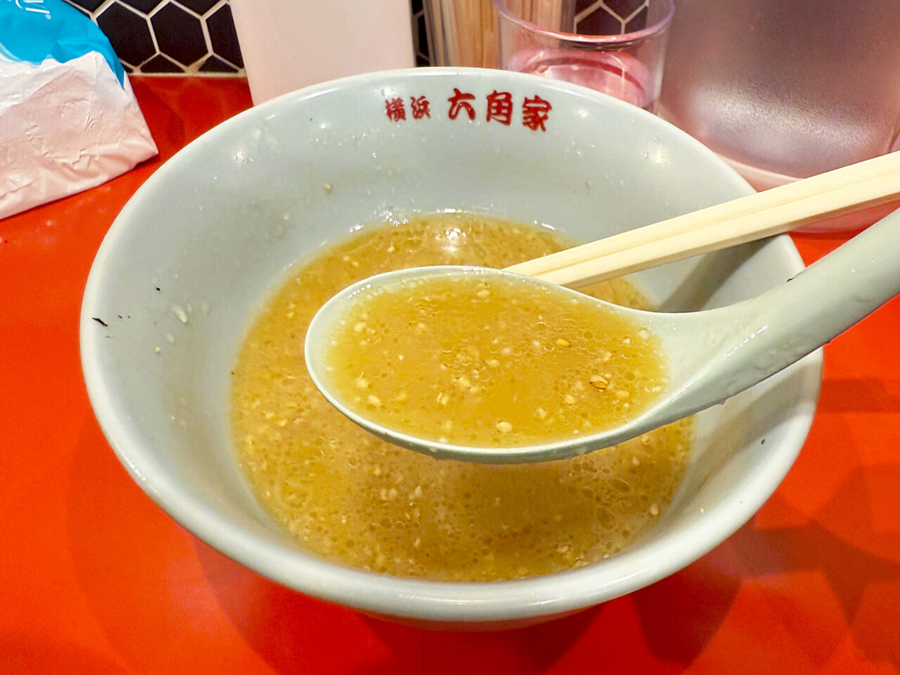 六角家系のスープは直系よりも醤油がマイルドで濃厚な味なので、ニンニク・豆板醤も合います。