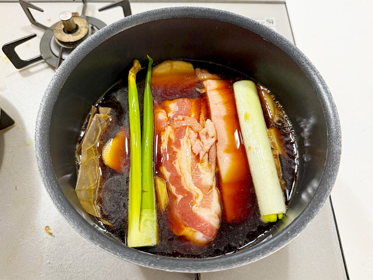 青ネギと生姜スライスは臭み消し用です。