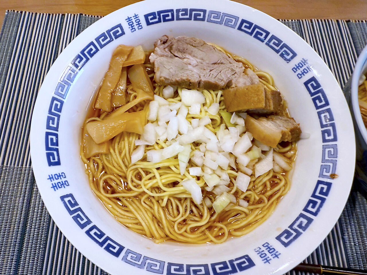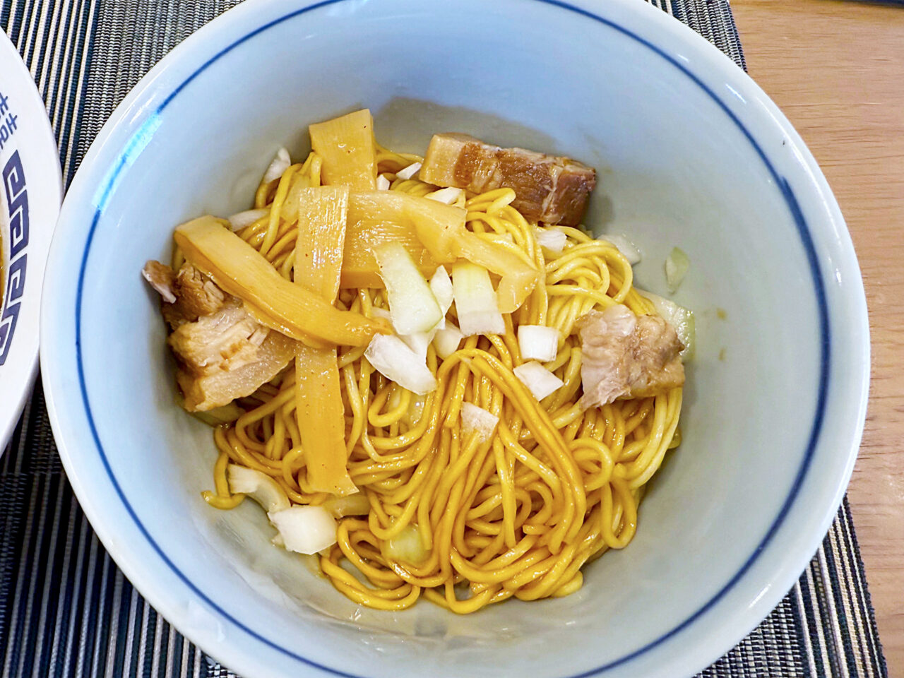 豚バラチャーシューと刻み玉ねぎと麺を合わせていただくと美味しいです。