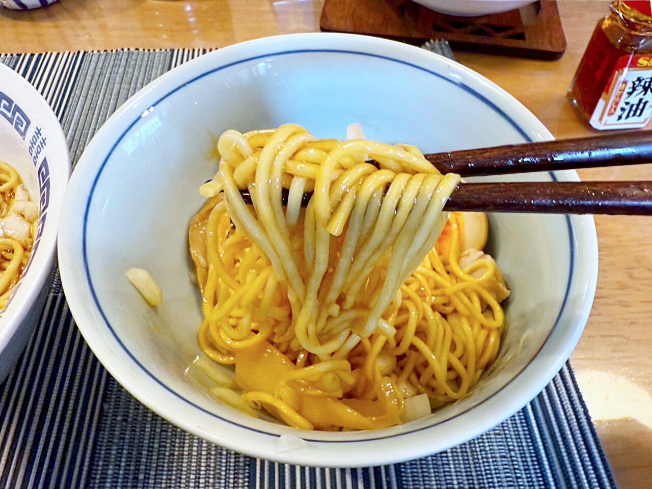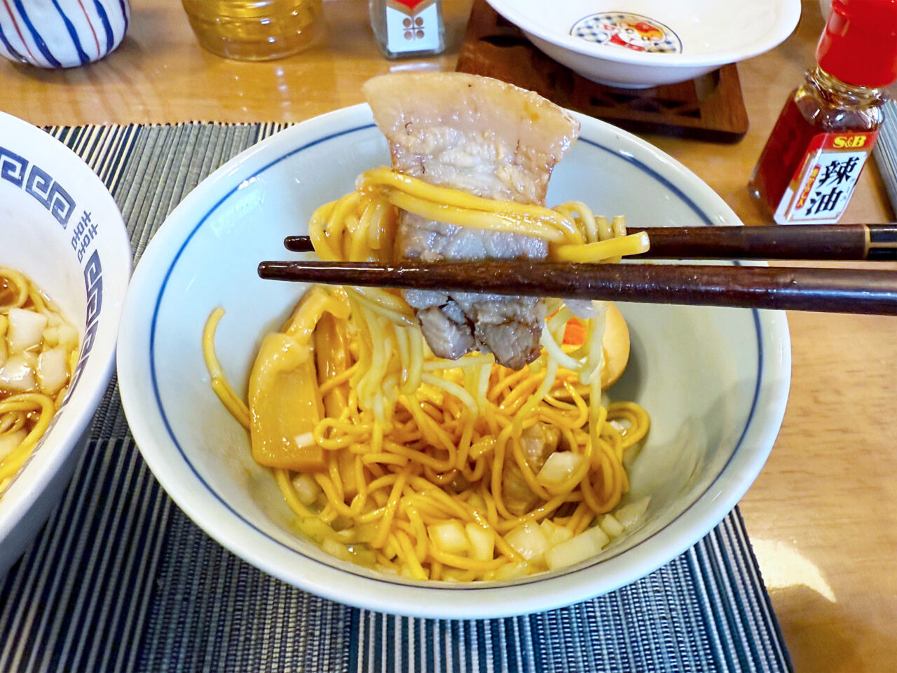 麺や具は同じですが、醤油ダレに植物油とごま油を加えて味を整えました。