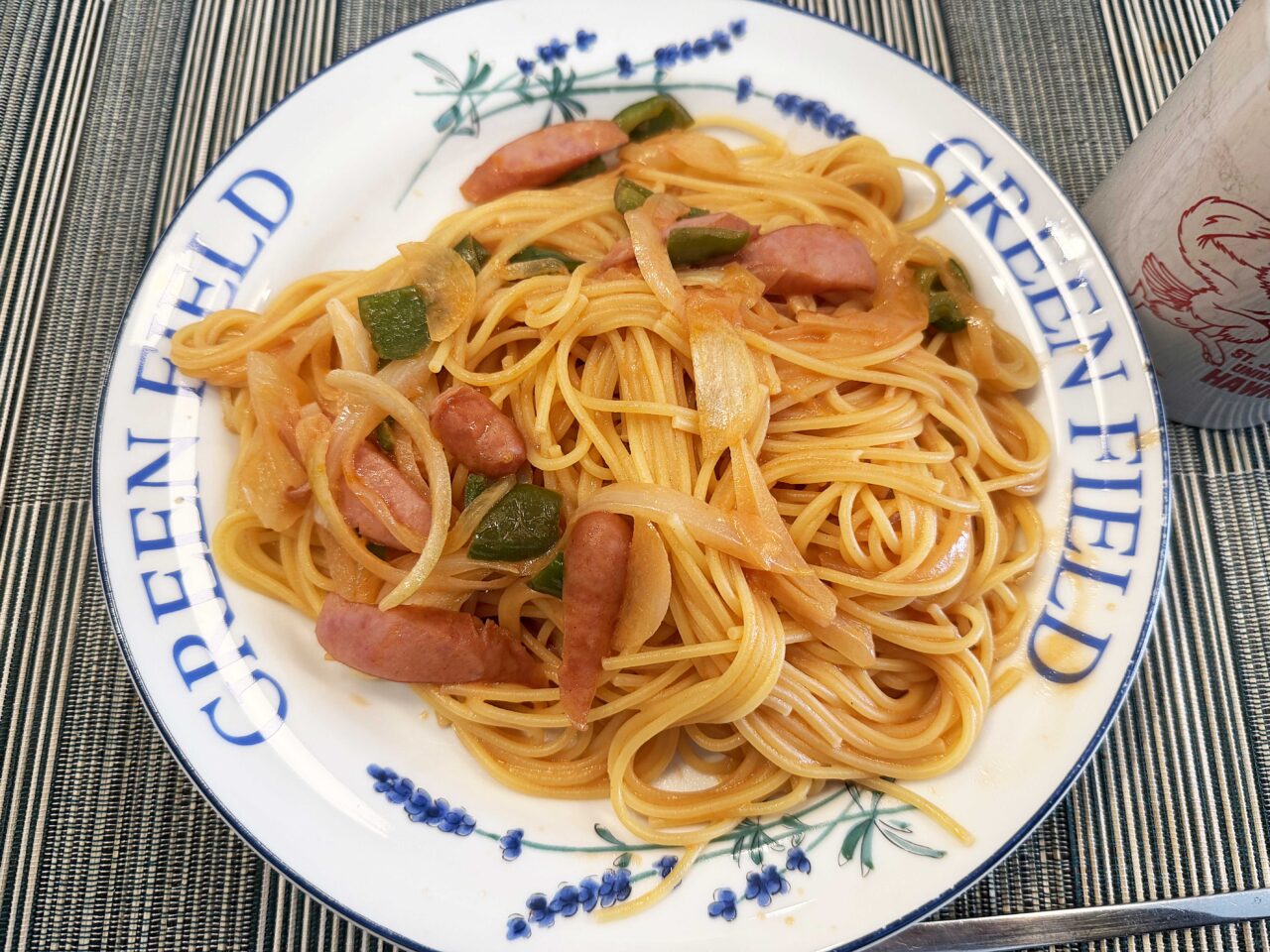 今日は仕事が忙しくて食べに行く時間がなかったので、冷蔵庫の材料を使って、「お手軽ナポリタン風」を作りました。