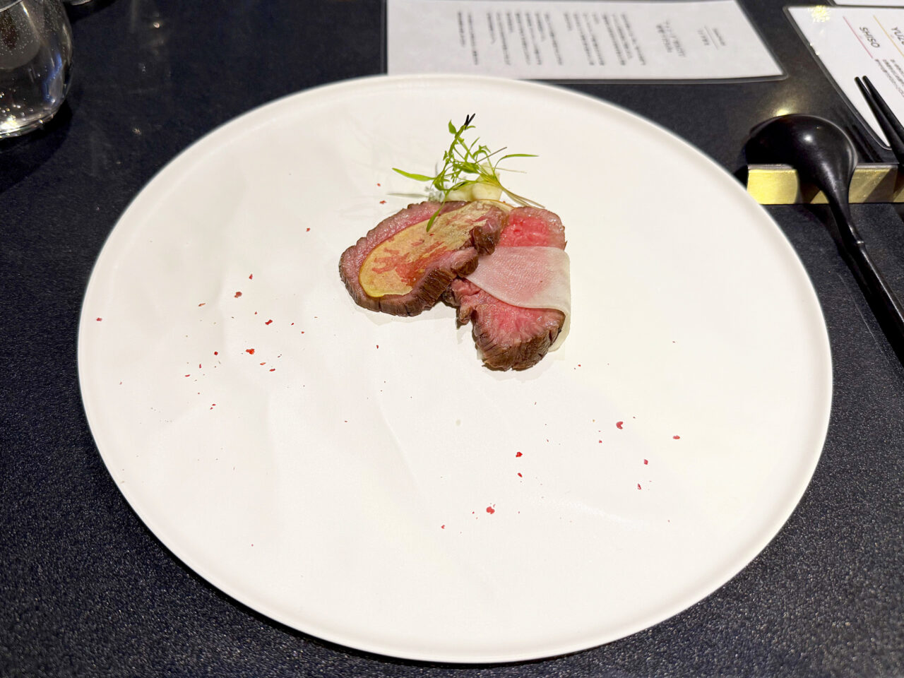 「ロースト黒毛和牛、百合根ピュレ 昆布締め林檎と大根の薄衣」。