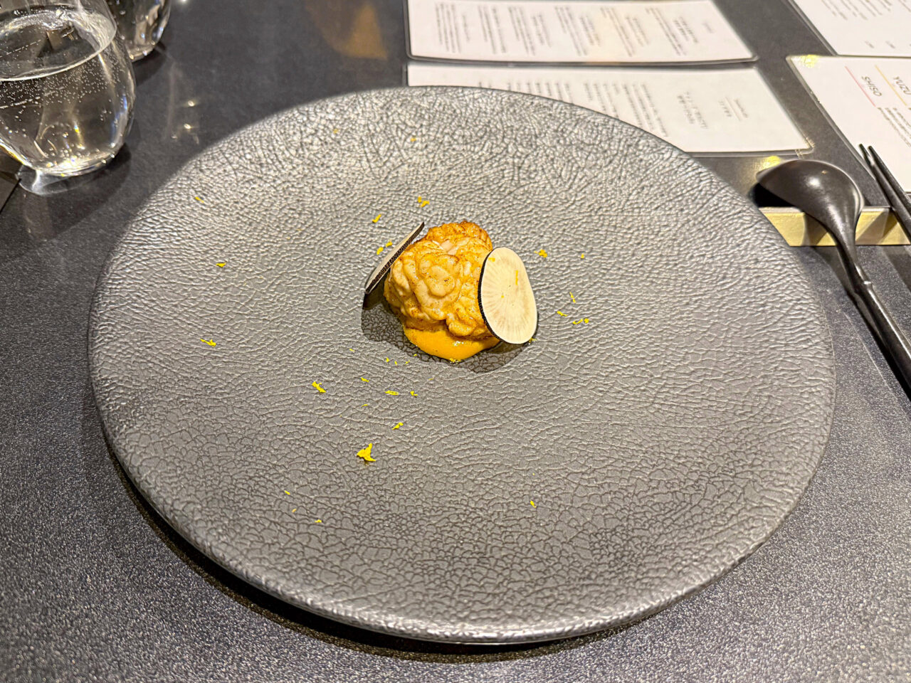 「黒大根のマリネと白子のムニエル 雲丹の温ソース、柚子の香り」。