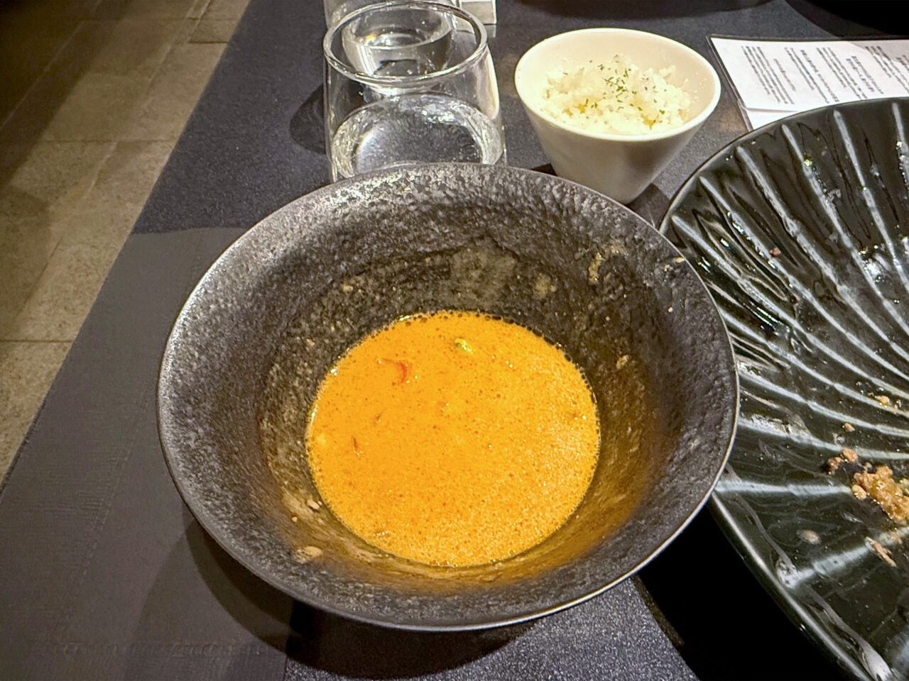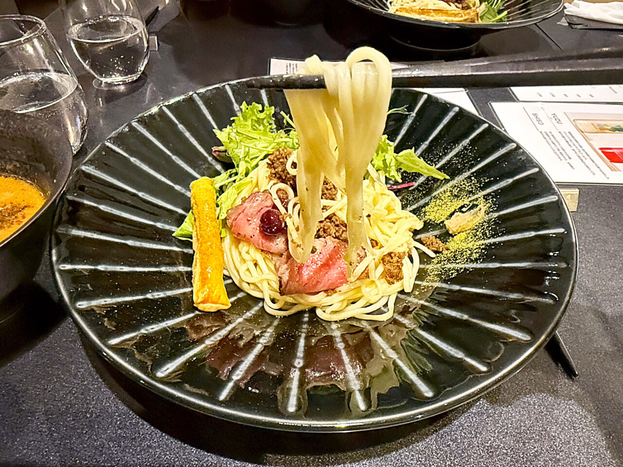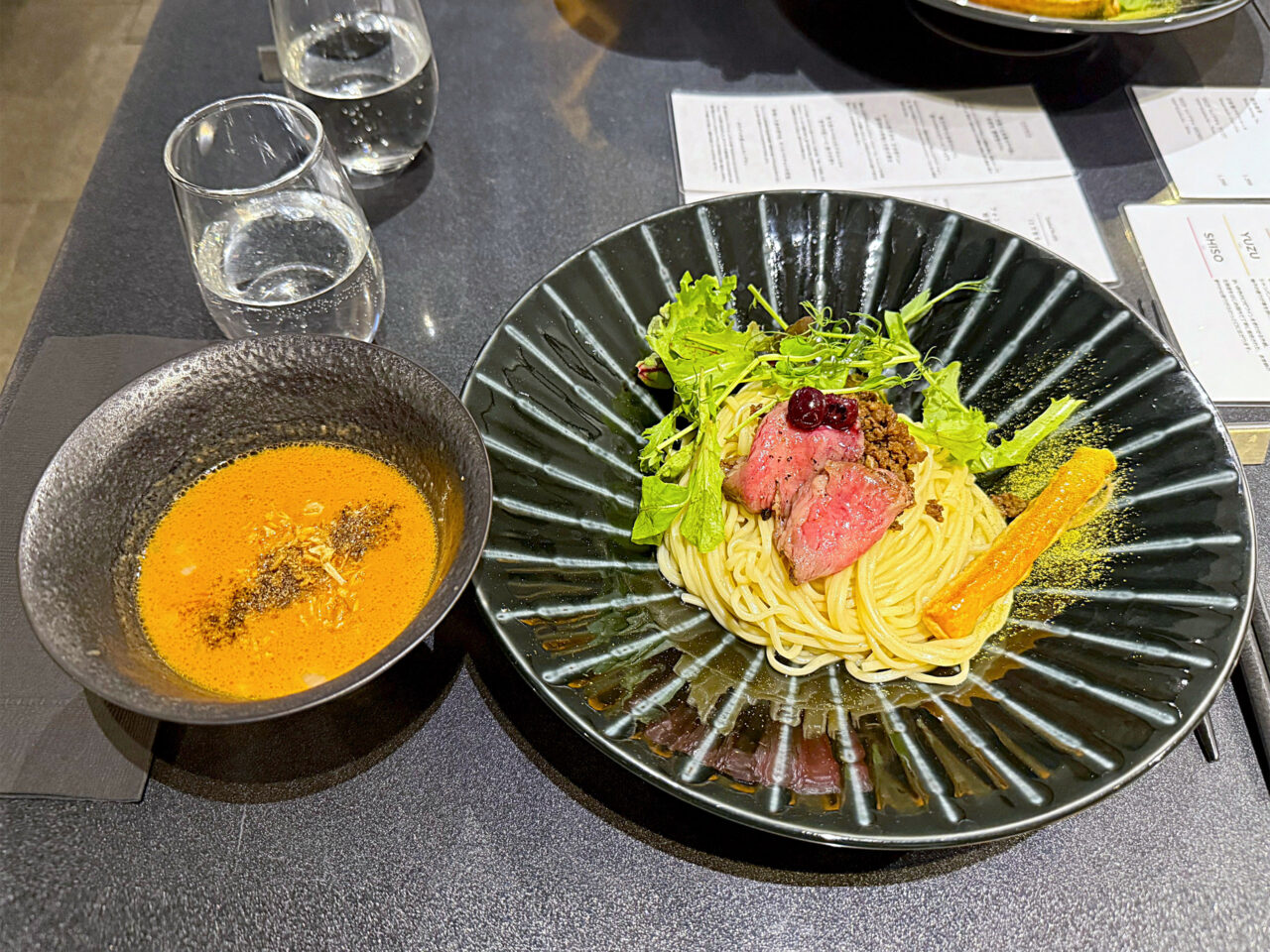 メインの「フォン・ド・WAGYU 味噌つけSoba」は、三種の味噌にA5黒毛和牛の旨味を重ねた芳醇なスープと、マロンスープをまとわせた麺が美味しいです。
