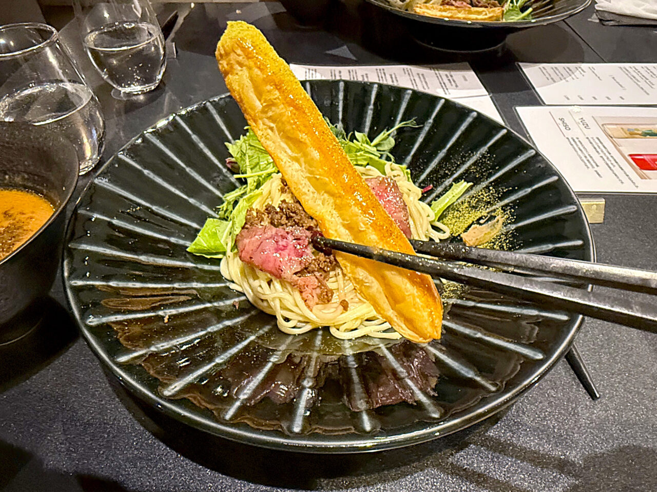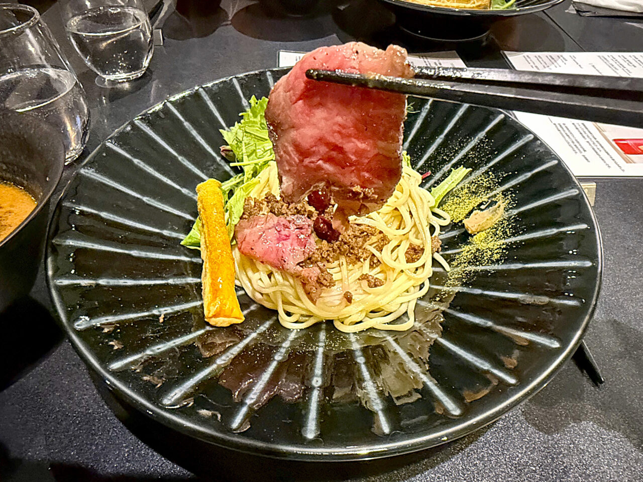 A5黒毛和牛ローストビーフとクランベリーにパイを合わせると言う、もはやラーメンの枠を超えた料理です。
