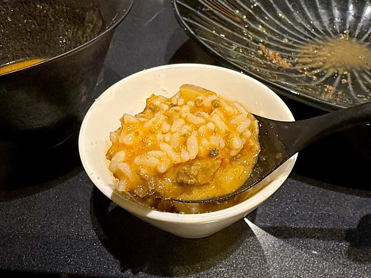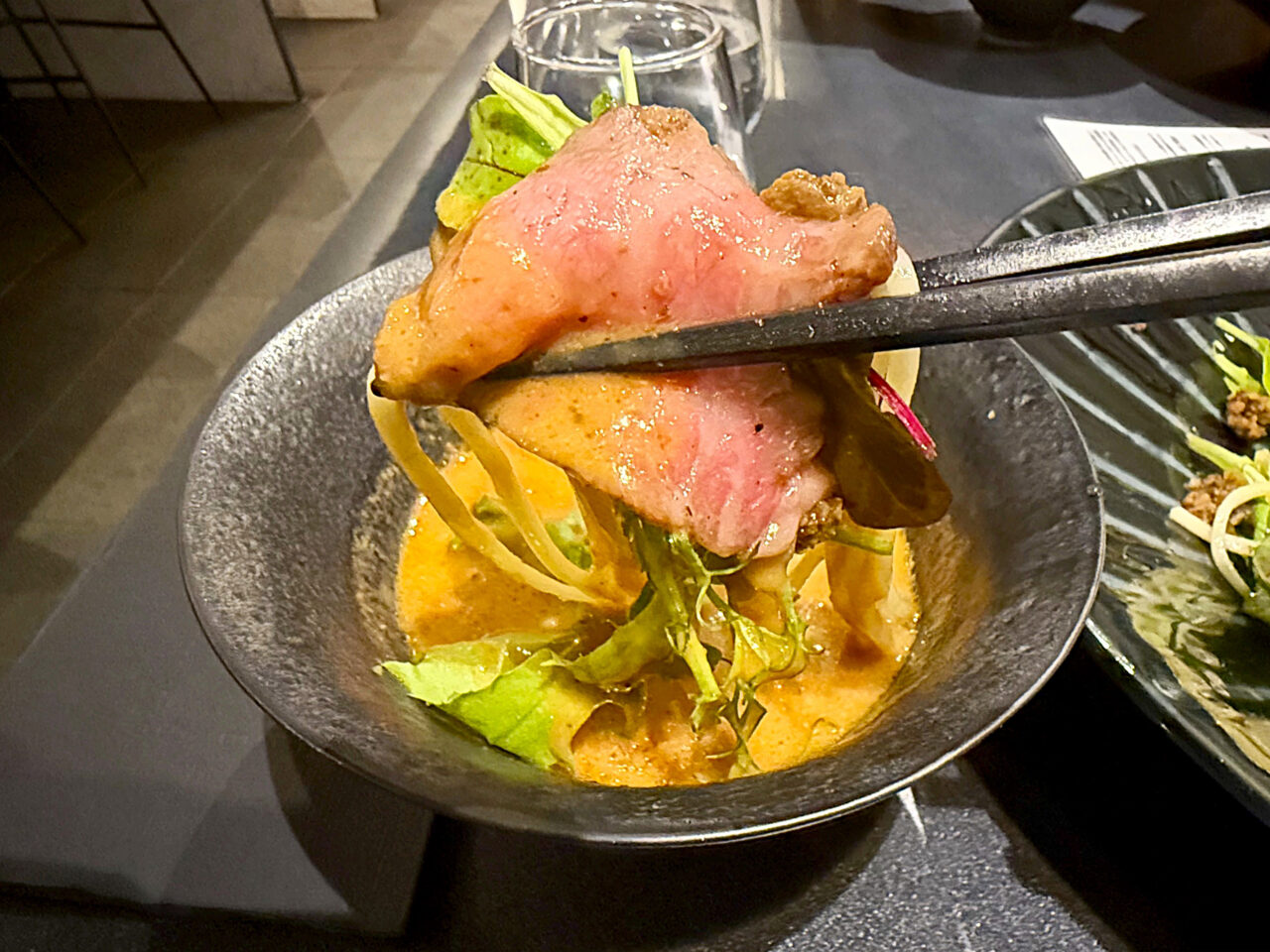 スパイシーなA5和牛ローストビーフに和牛の旨味の味噌味スープと言う、これまた牛×牛の組み合わせ。