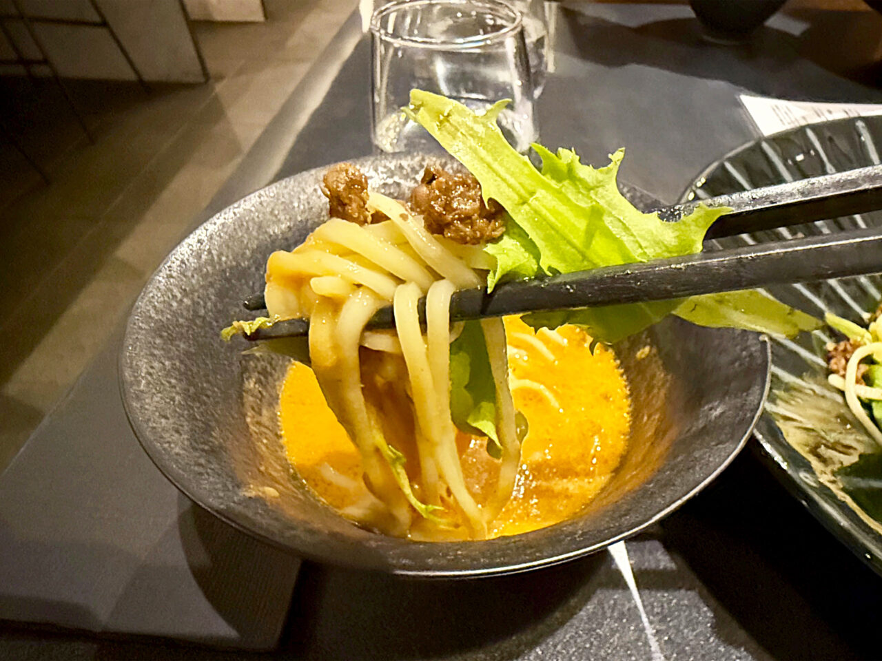「和牛肉味噌」とベイビーリーフを絡めて麺をいただきます。