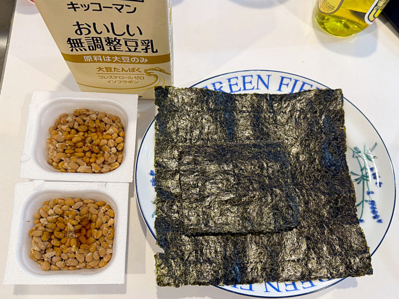 納豆2パック、無調整豆乳240cc、大判海苔2枚(6g)。