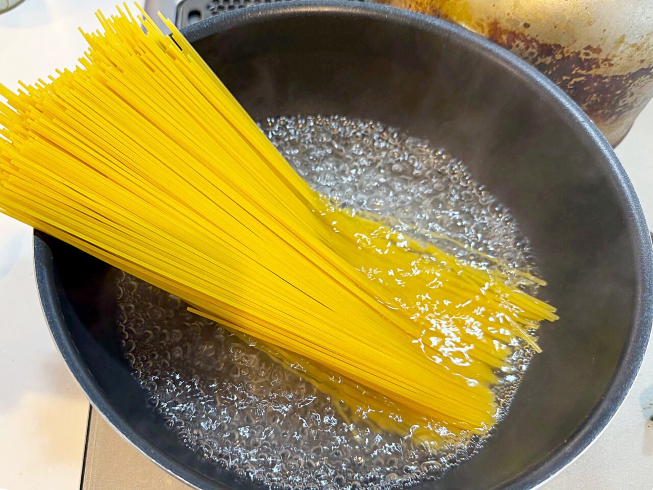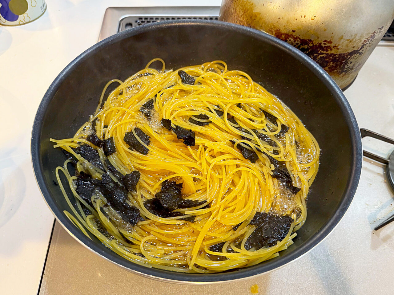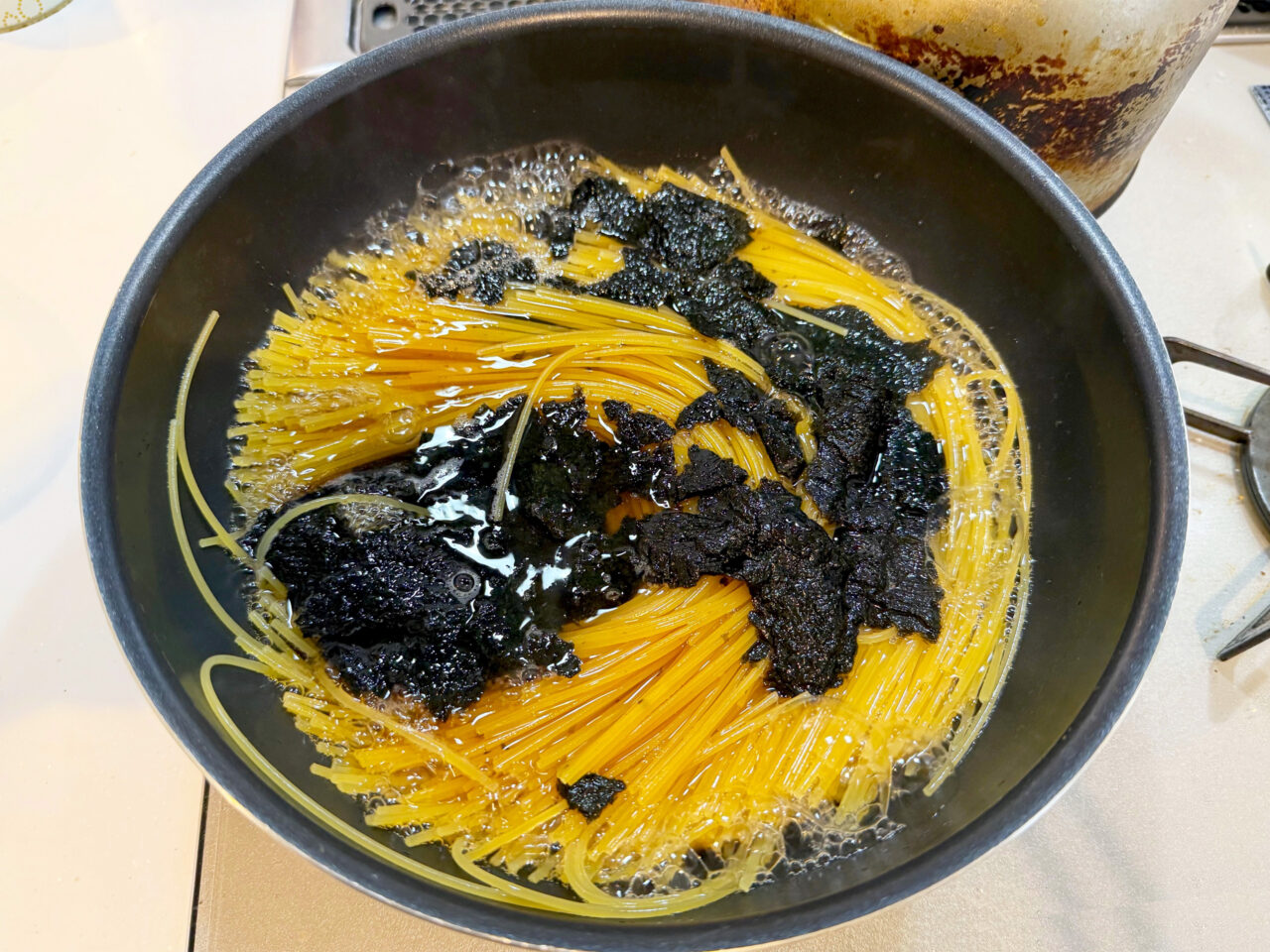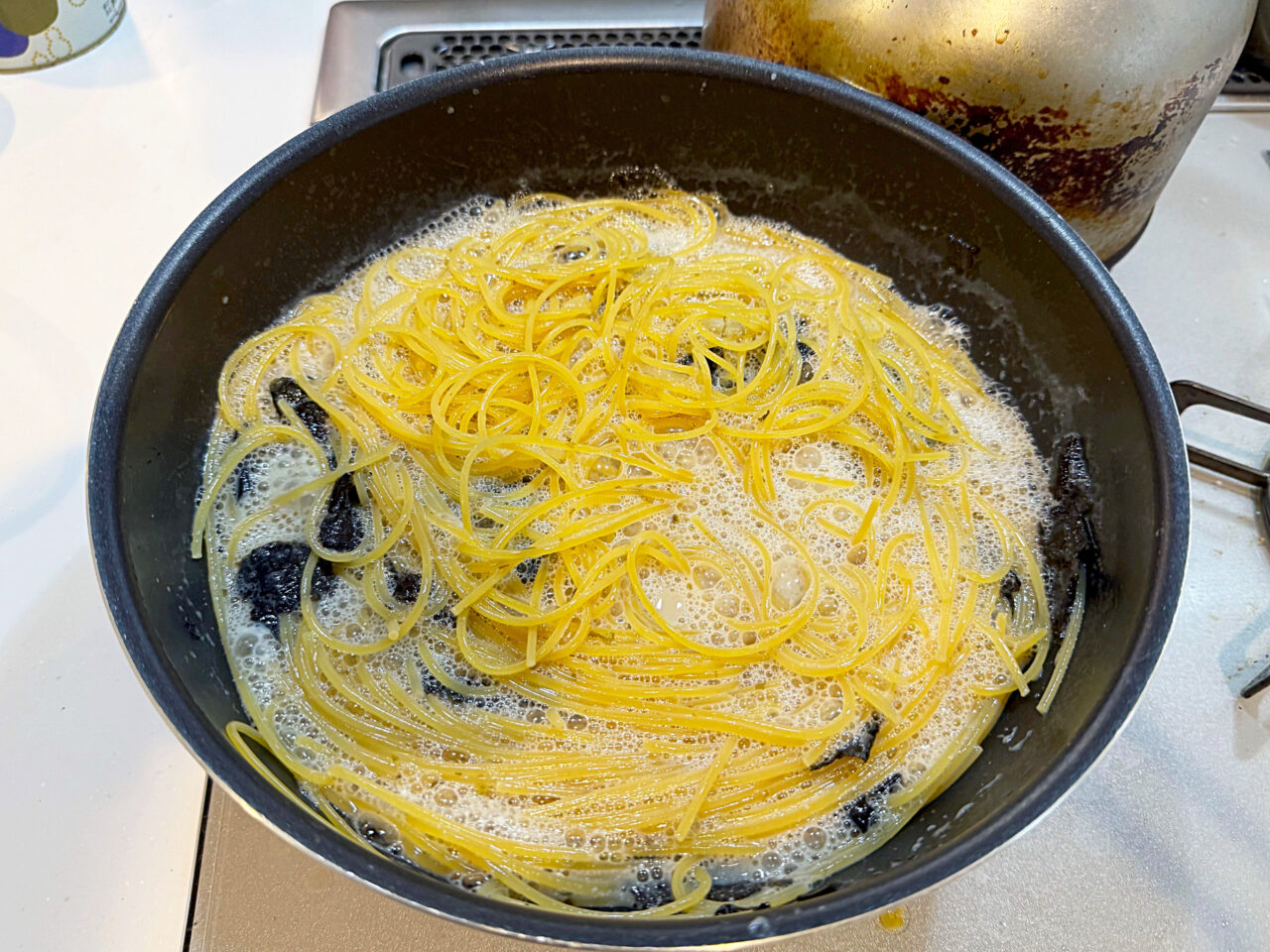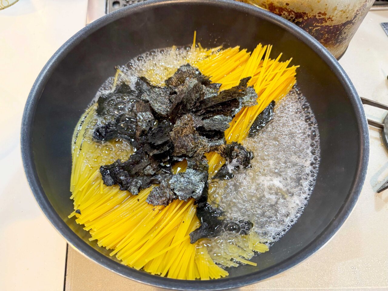 ワンパンなので、水と塩とパスタ、ほんだしも加えて煮て行きます。
