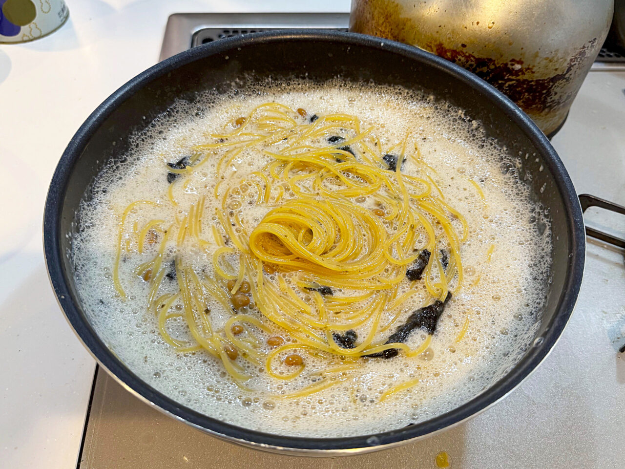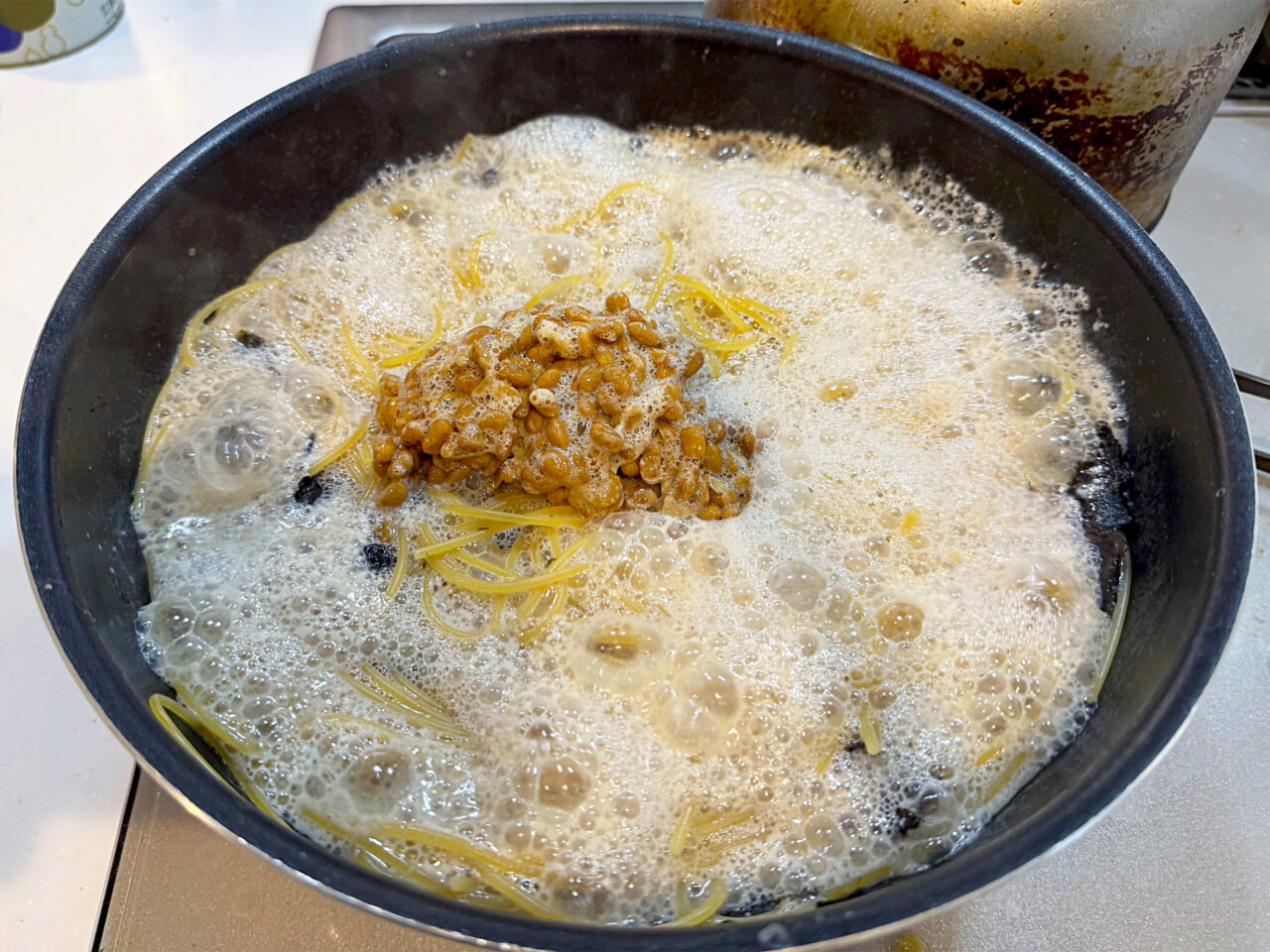 煮詰まって来て、パスタの澱粉と豆乳と納豆の粘りでかなりクリームっぽくなります。