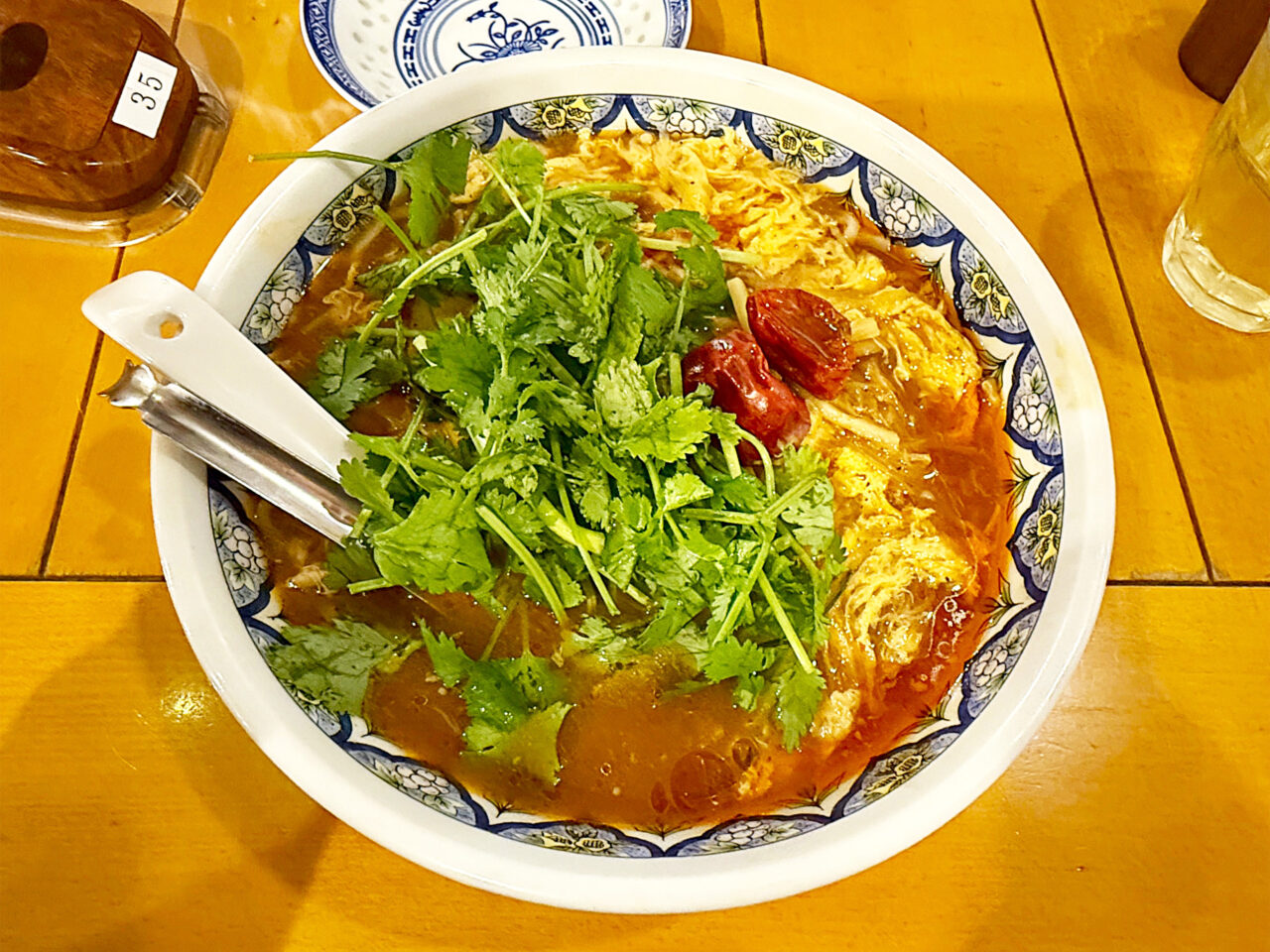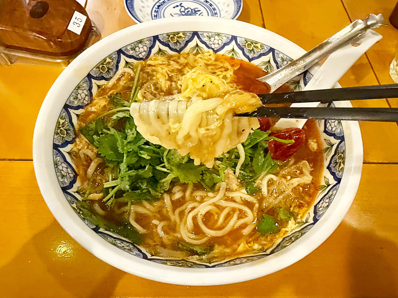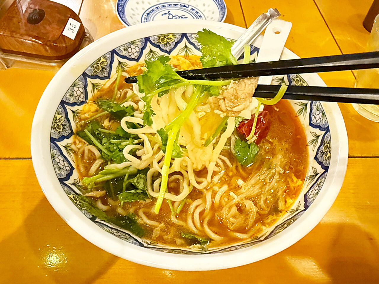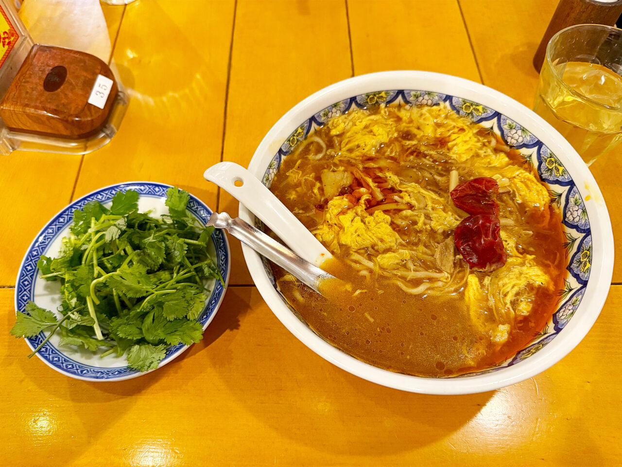 「激辛酸辣湯麺」+「トッピングパクチー(コリアンダー)」。