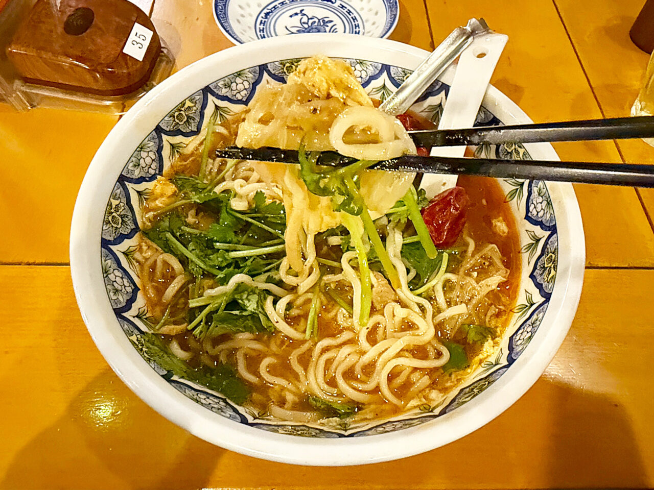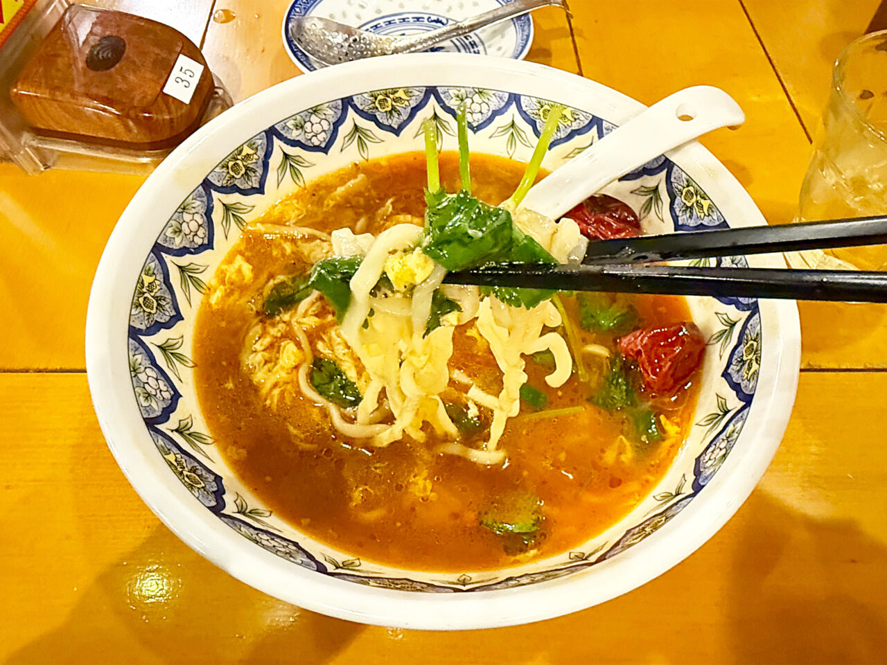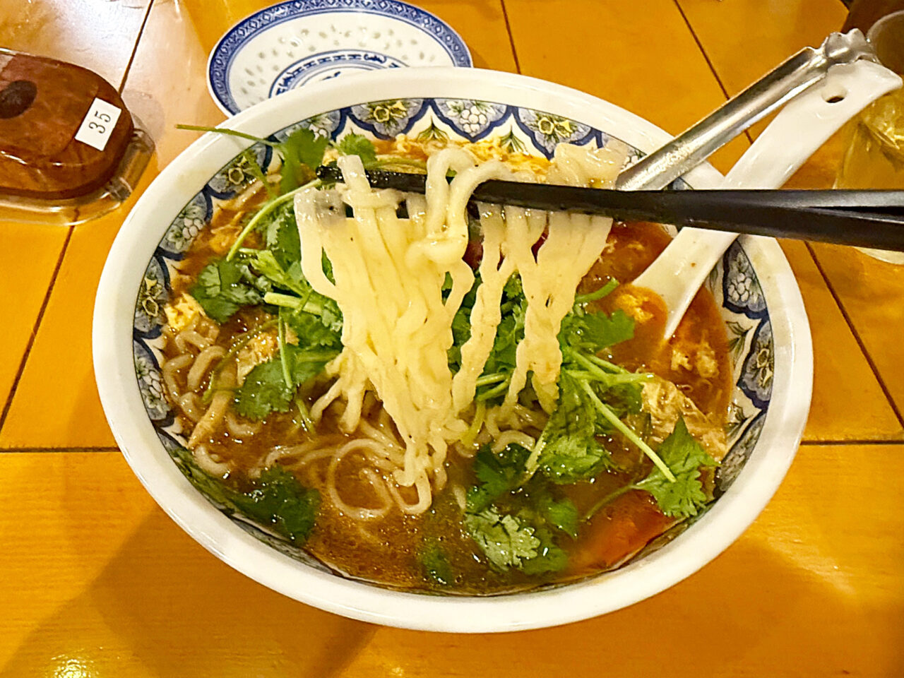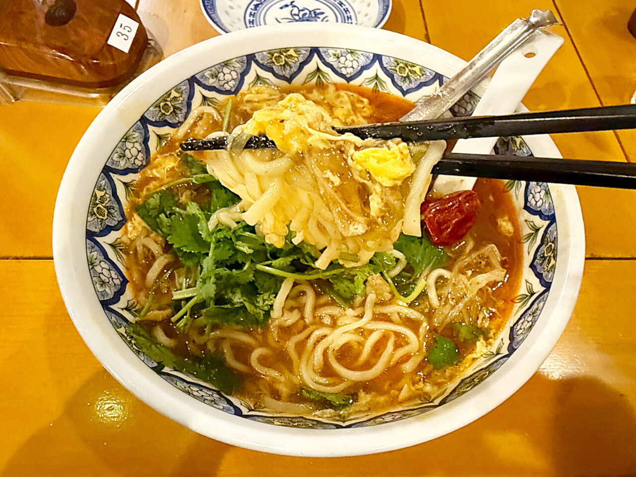 「激辛酸辣湯麺」+「トッピングパクチー(コリアンダー)」。
