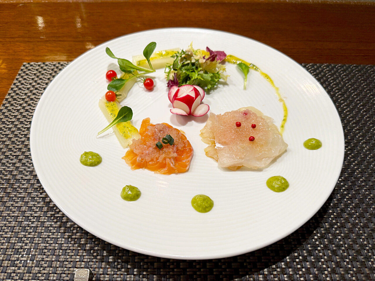 ホワイトアスパラが添えられた、サーモンと鯛のカルパッチョ。