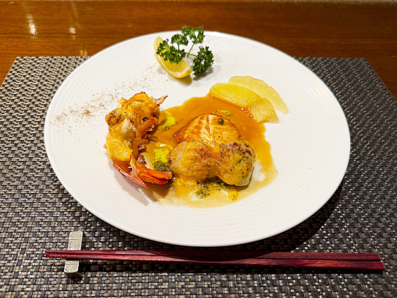 香ばしく焼き上げたホタテとメバルに、オレンジを使ったソースが美味しいです。