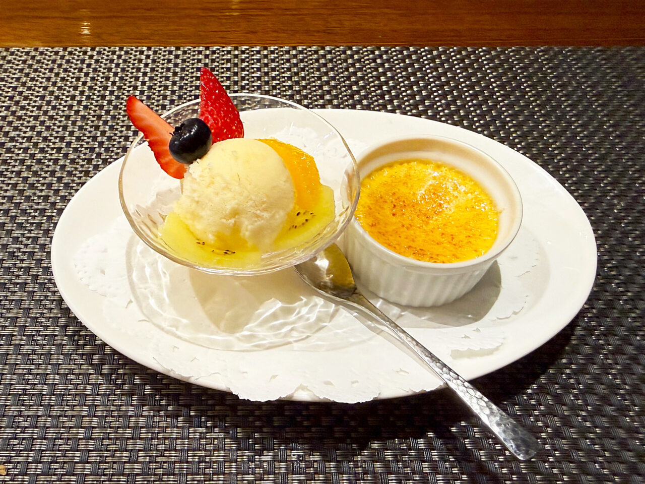 デザートのフルーツとラ・フランスのジェラート、クレームブリュレ。