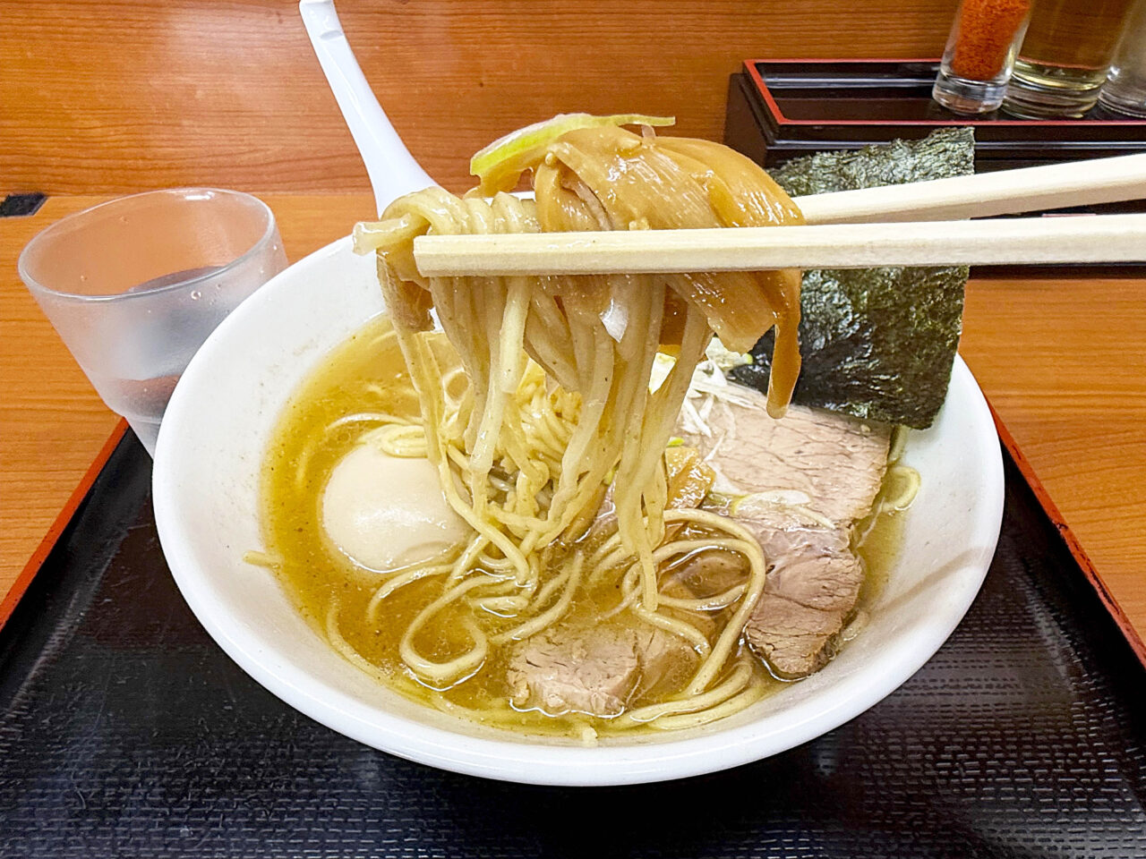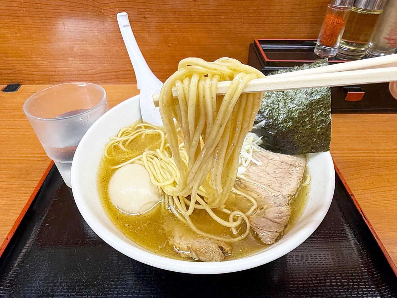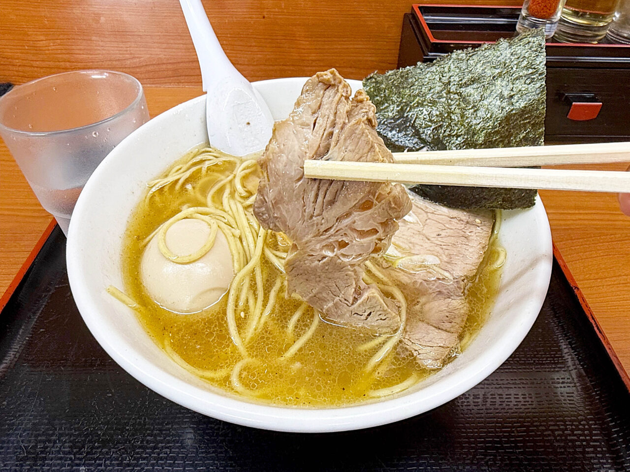 面白い食べ方としては、海苔をスープに浸して味玉を包む方も居ます。