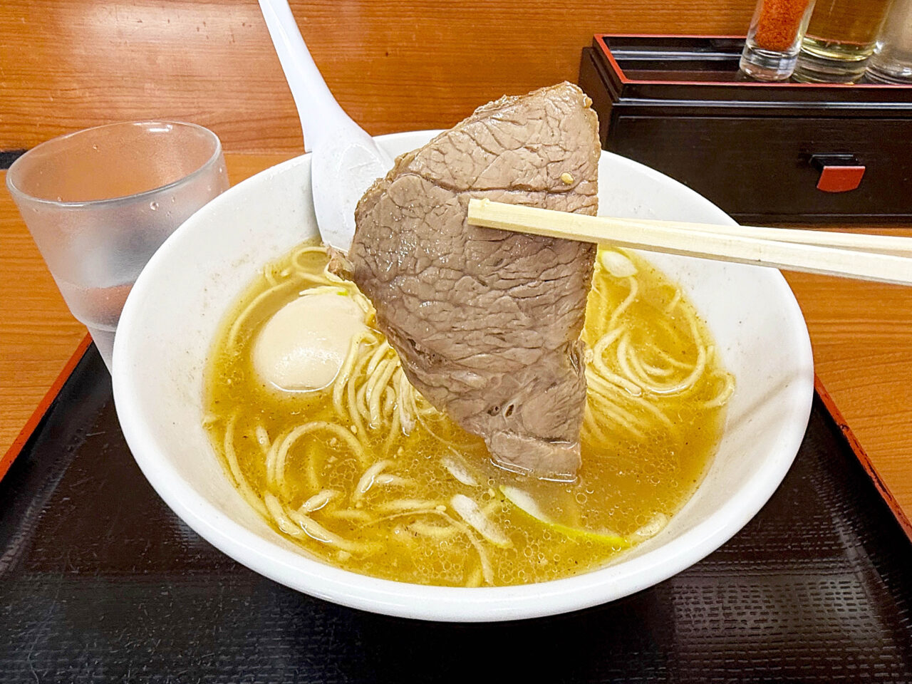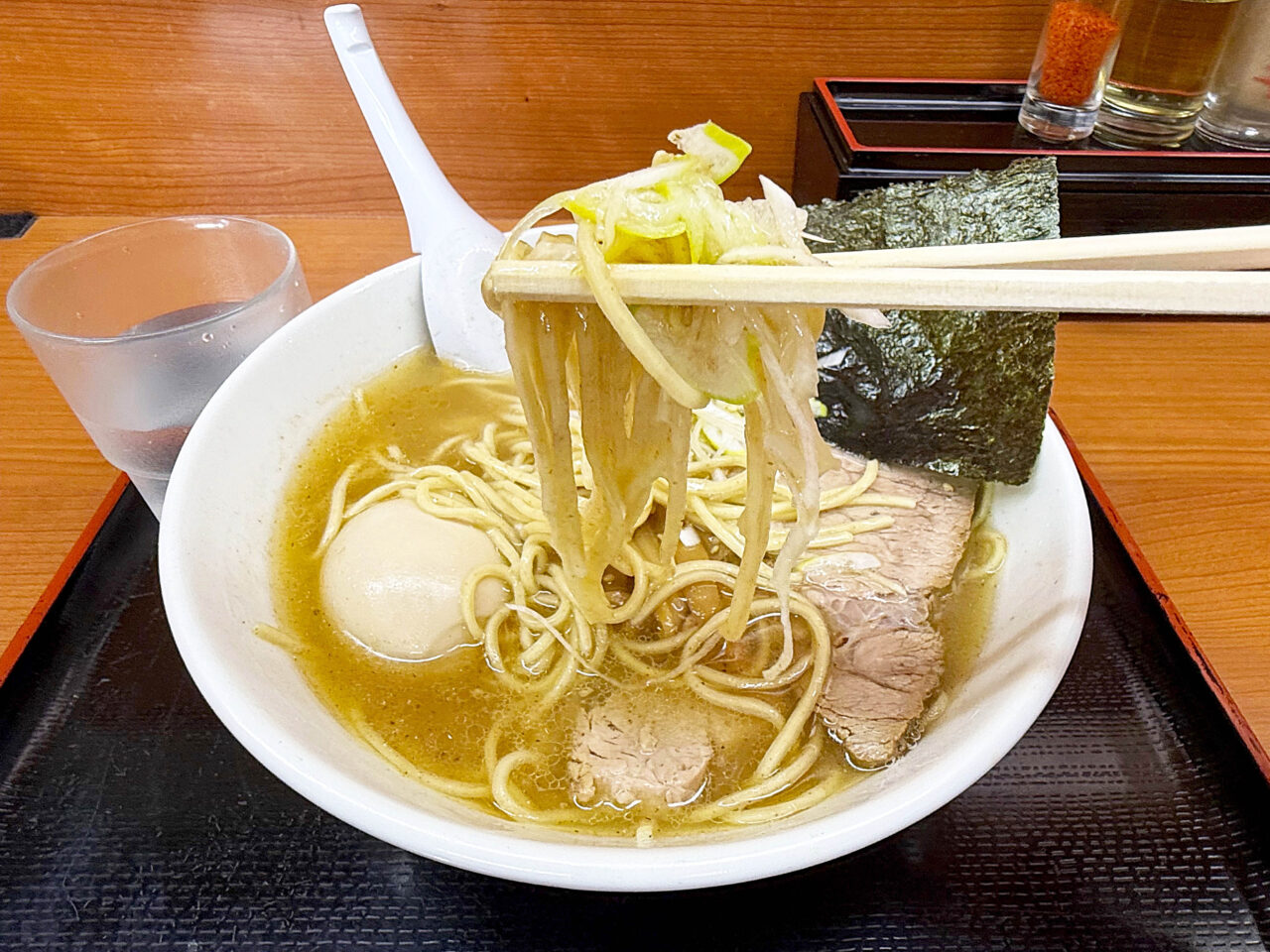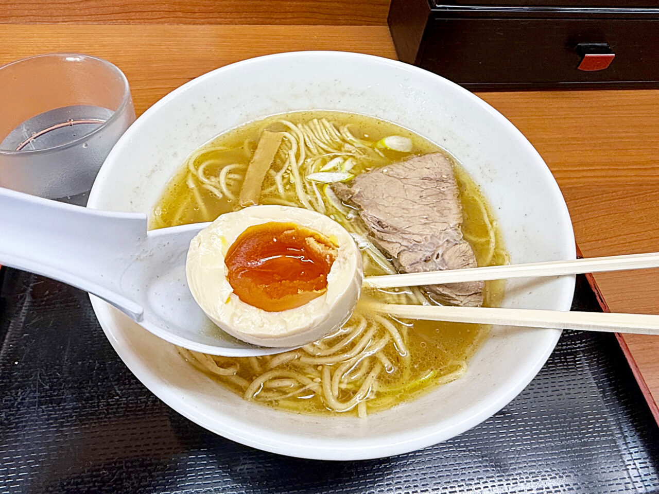 面白い食べ方としては、海苔をスープに浸して味玉を包む方も居ます。