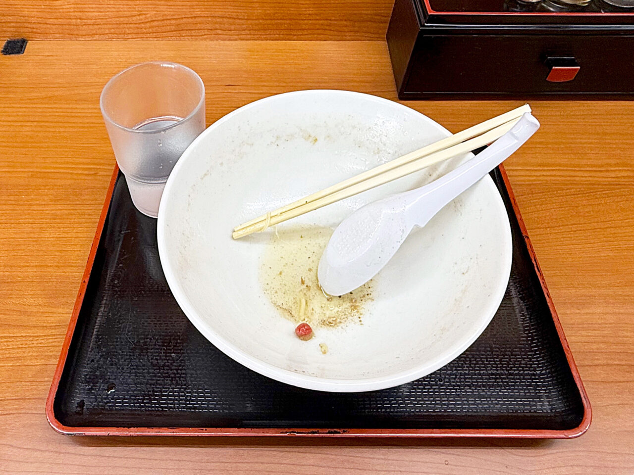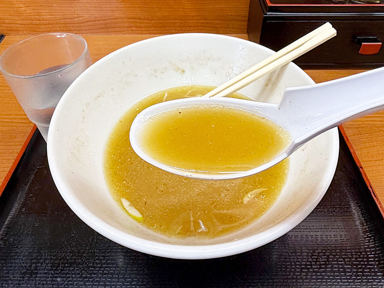 麺と具を食べ終えてスープを味わいます。