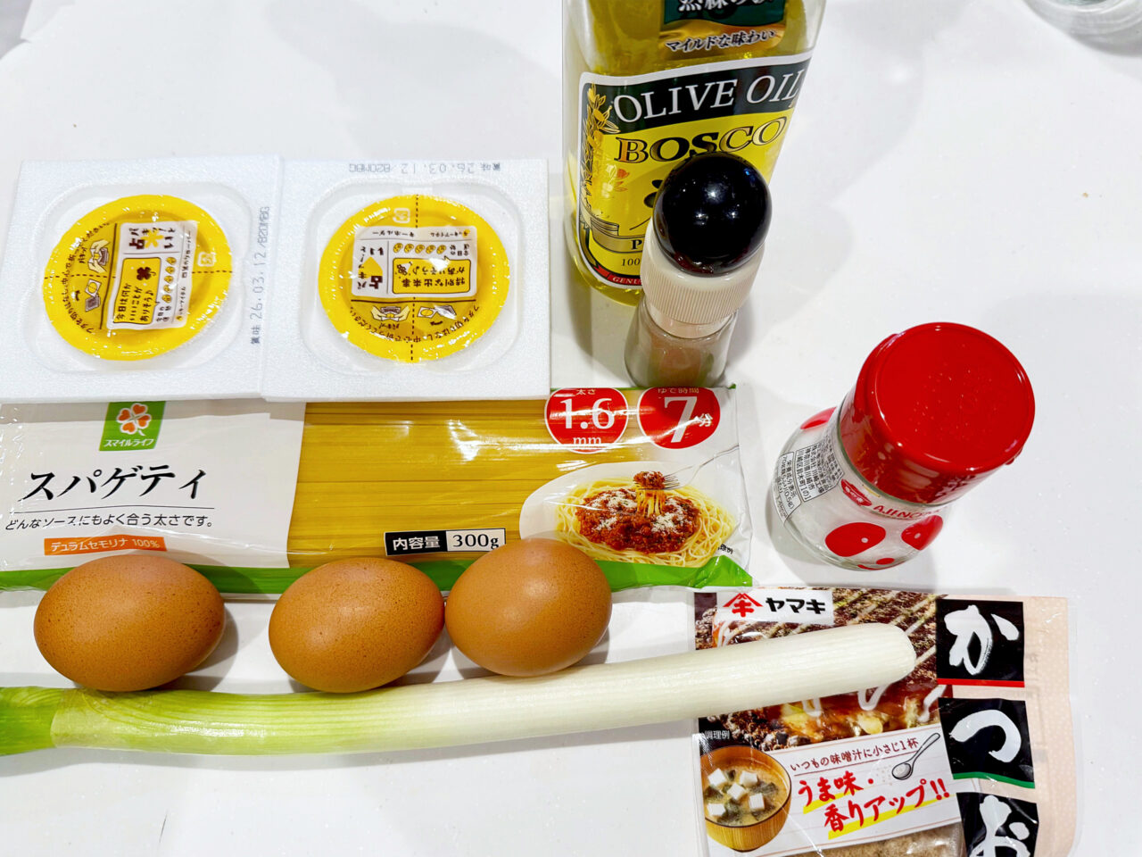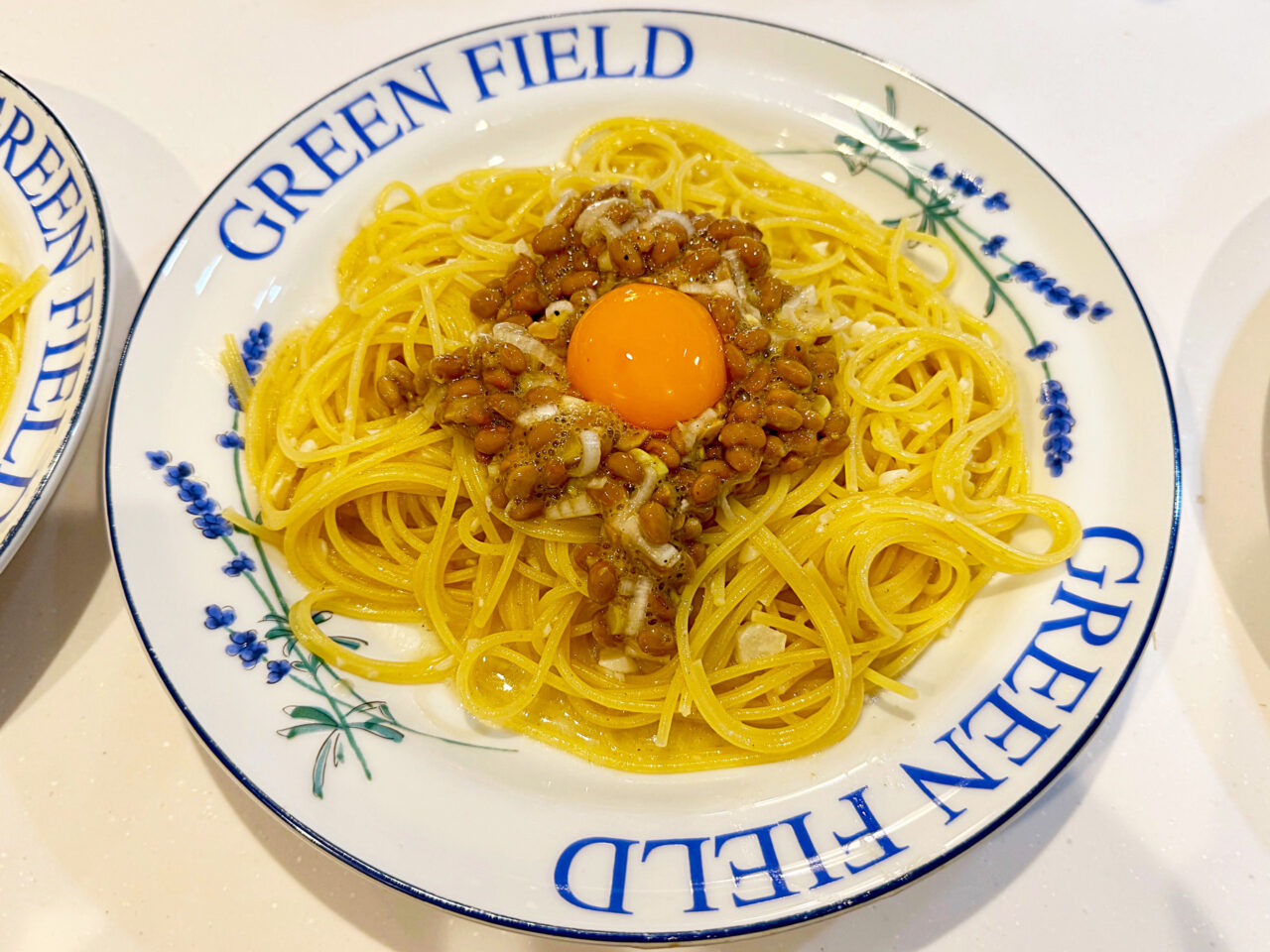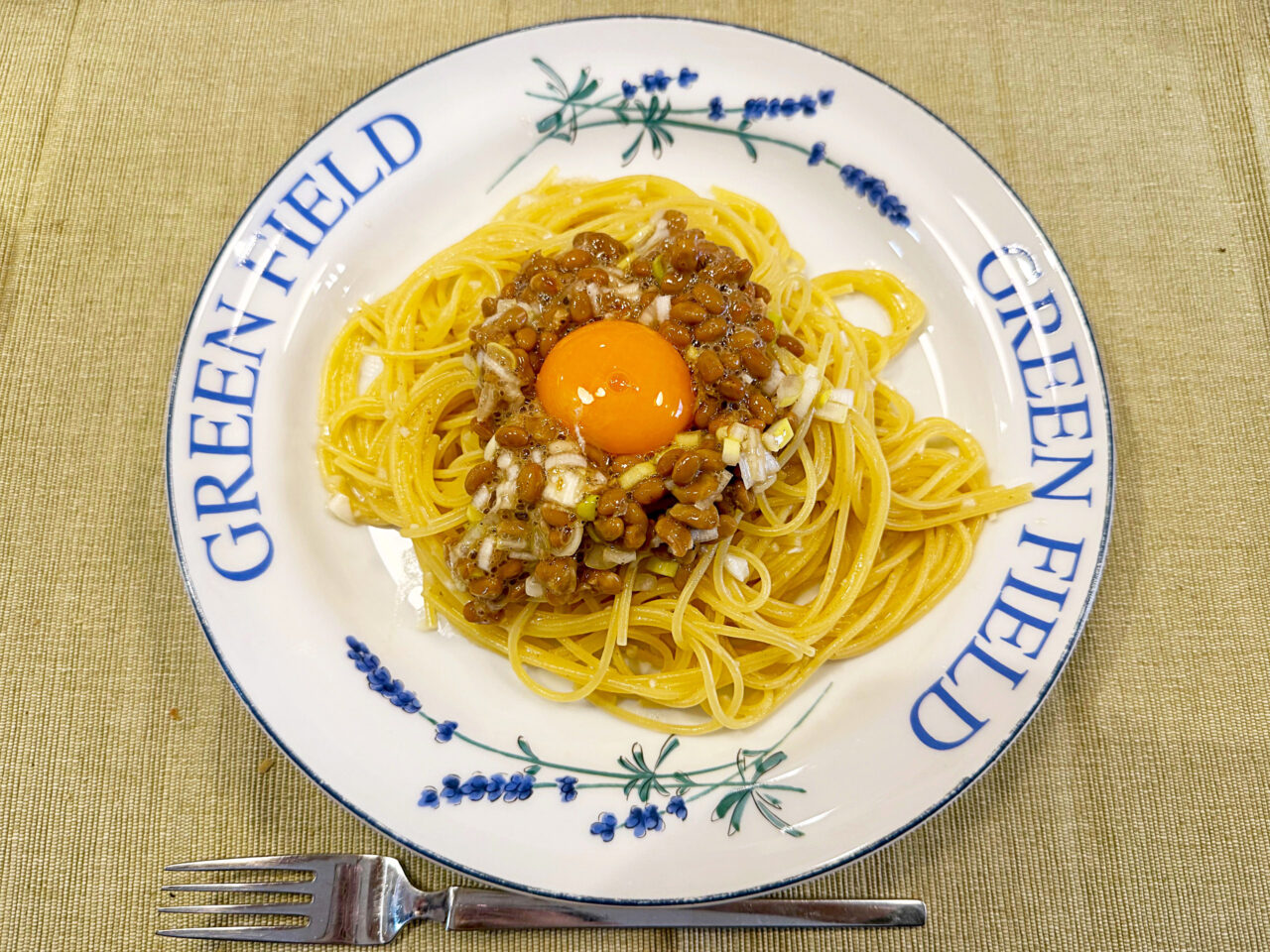 長ねぎ、納豆、黒胡椒、オリーブオイル、にんにく、水、酒、鰹粉、味の素、塩、パスタ、卵黄です。