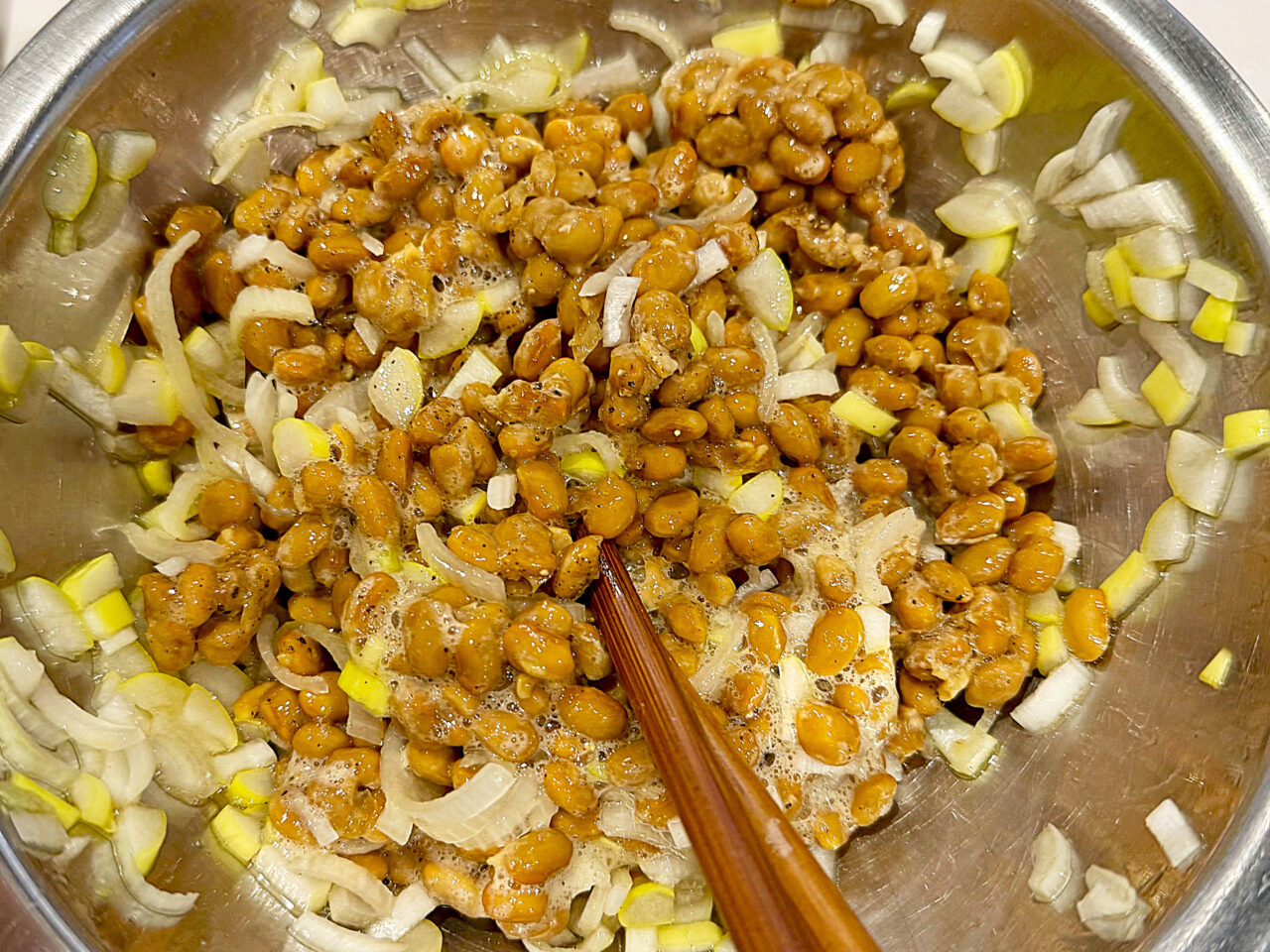 まずは「納豆1パック、付属のタレ、黒胡椒を混ぜておく」と言う事で、納豆にネギと調味料を入れて混ぜます。