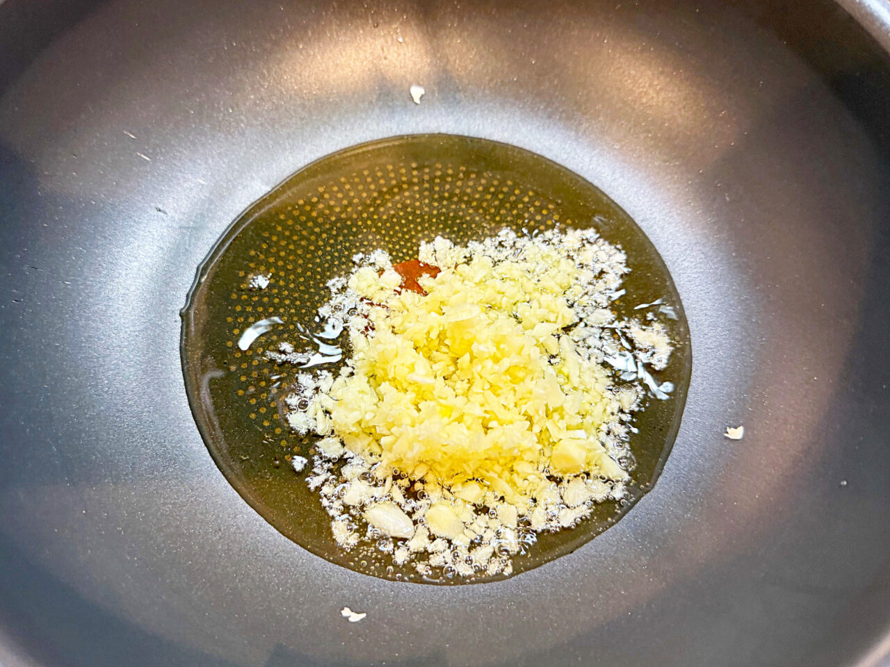 3人分なので、オリーブオイルは大さじ3、ニンニクは2片と有りましたが大きさを見て4片程微塵切りにして入れました。