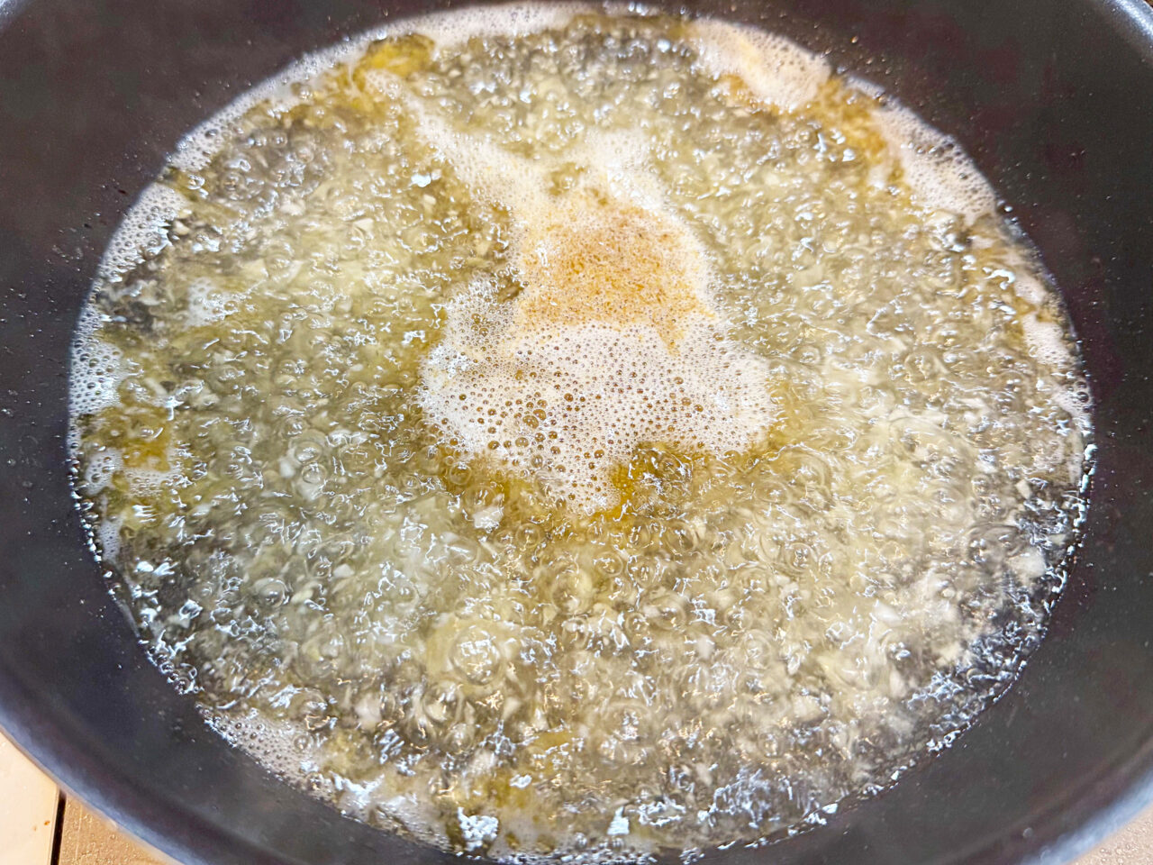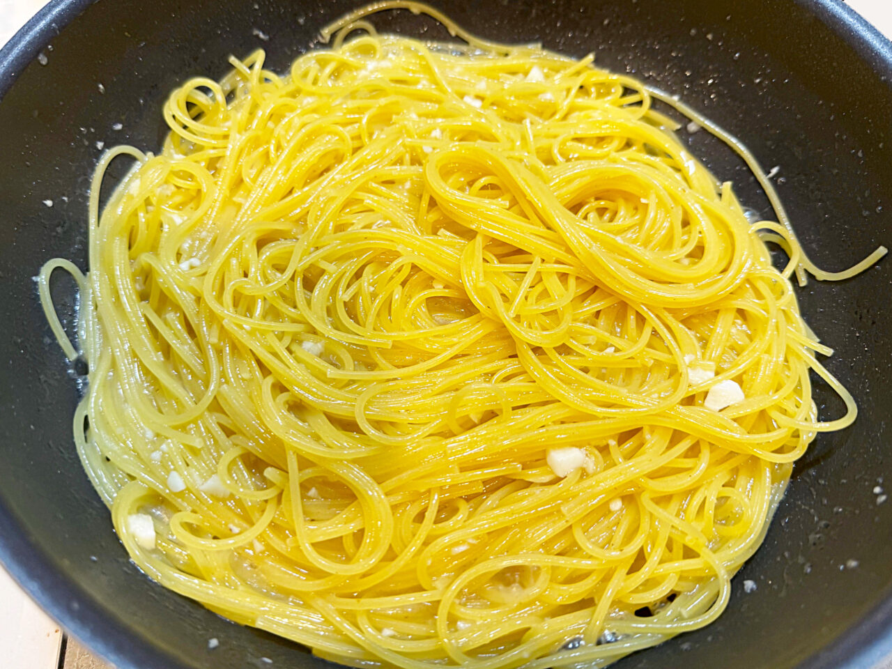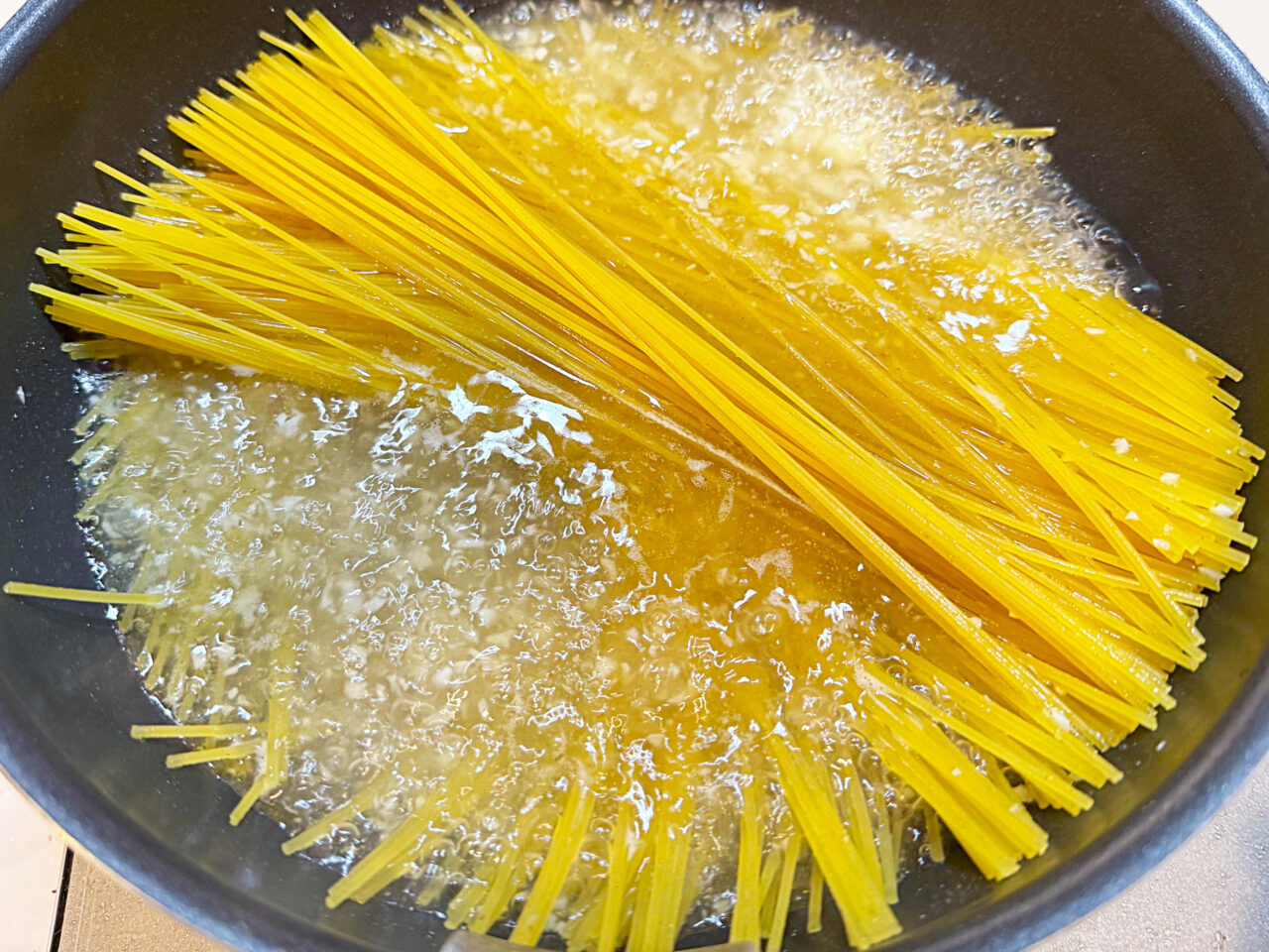 「1.4mmのパスタ100g入れ5分水分がなくなるまで煮る」ですが、我が家には1.6mmしか無かったので、茹で時間を調整して7分程煮ます。