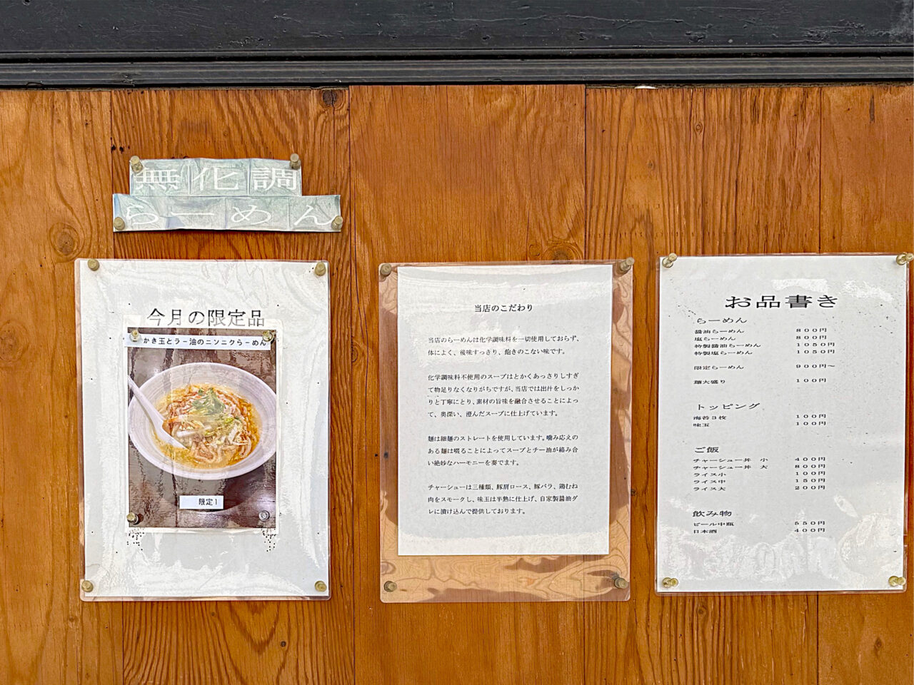 入口横の掲示板に「今月の限定品」として「かき玉とラー油のニンニクらーめん」が有ります。