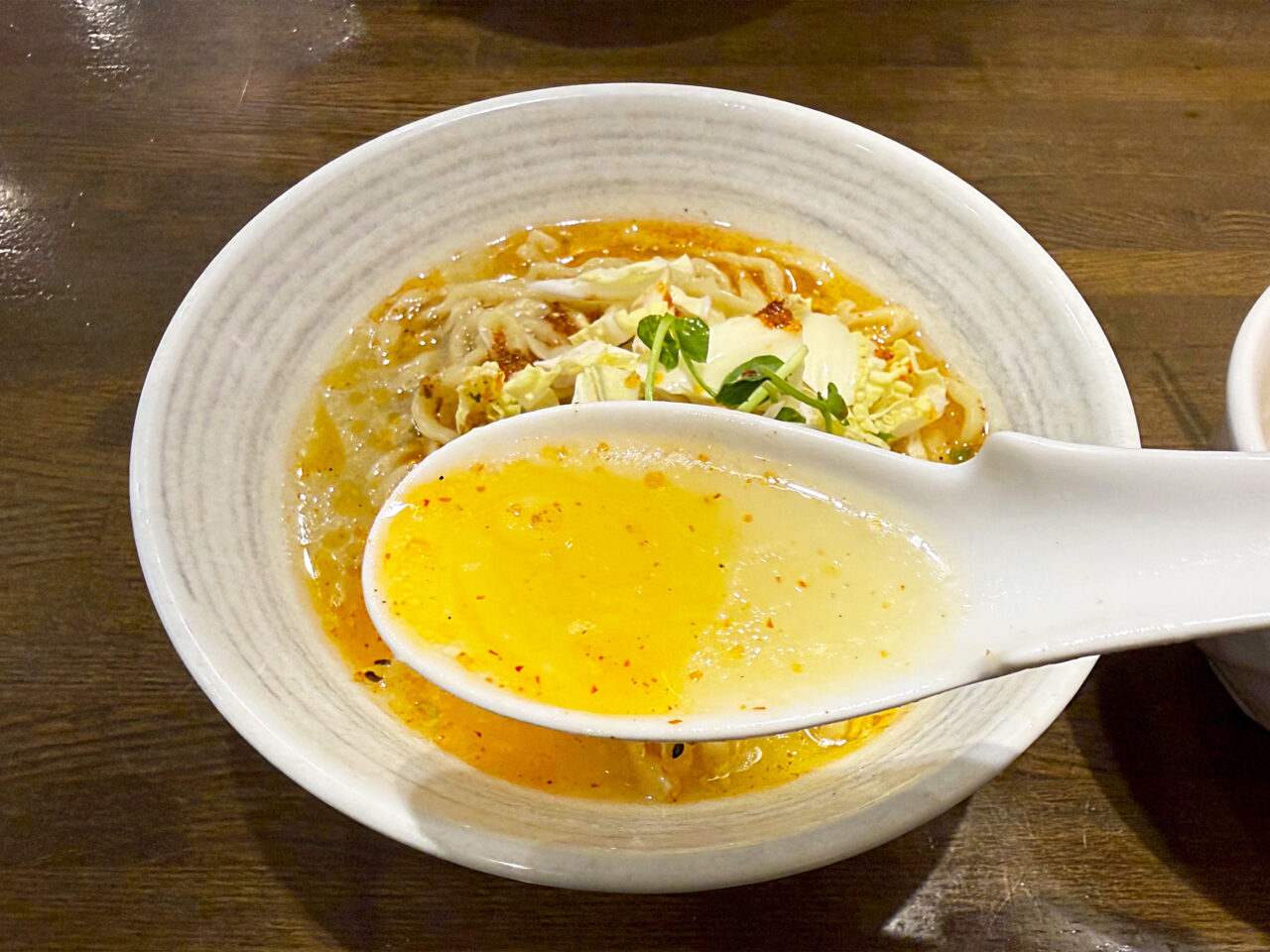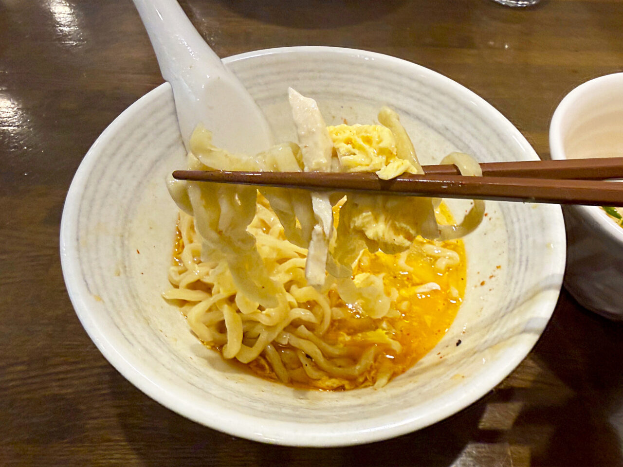 塩味の鶏のスープの旨味を自家製ラー油で膨らませて、辛味と共に香ばしさや厚みも加えています。