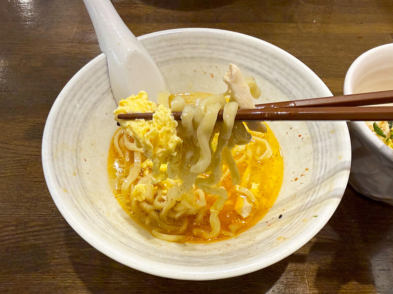 溶き卵に細切りの鶏胸肉、白菜、豆苗と言うトッピングも絶妙で、スープの味に合わせた食材のチョイスが見事です。