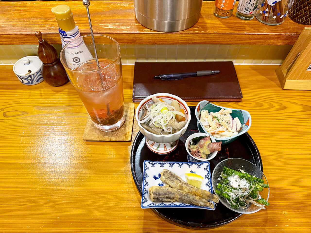 「塩モツ煮込み」、「うどんマカロニサラダ」、「ホタルイカの酢味噌和え」、「菜の花の冷製ペペロン」、「メヒカリ唐揚げ」です。