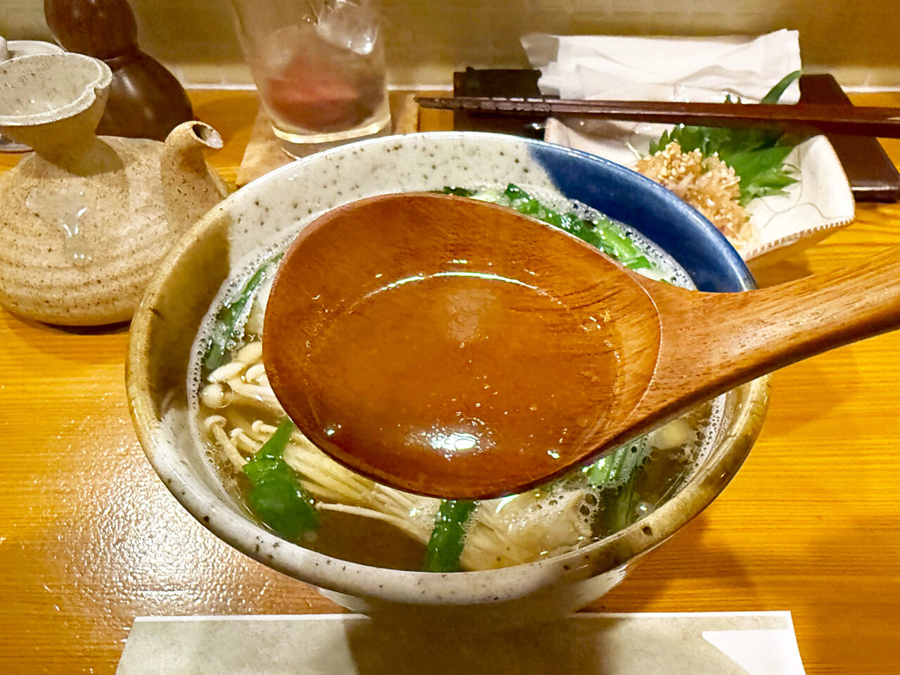 「油かす」やエノキやニラの旨味が溶け込んだお出汁。