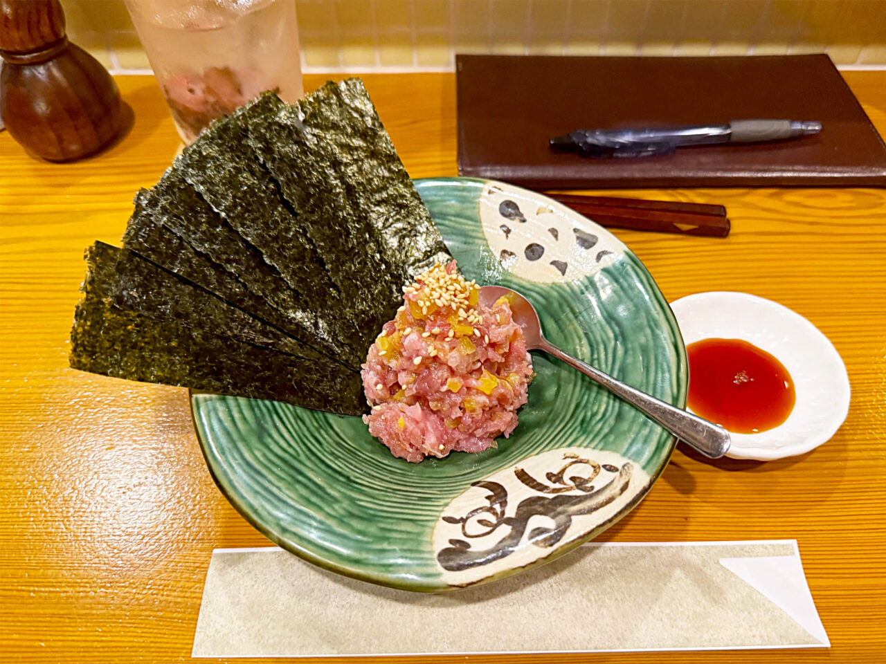 「本マグロのトロタク」を海苔で巻いていただくのですが、これが実に美味いです。