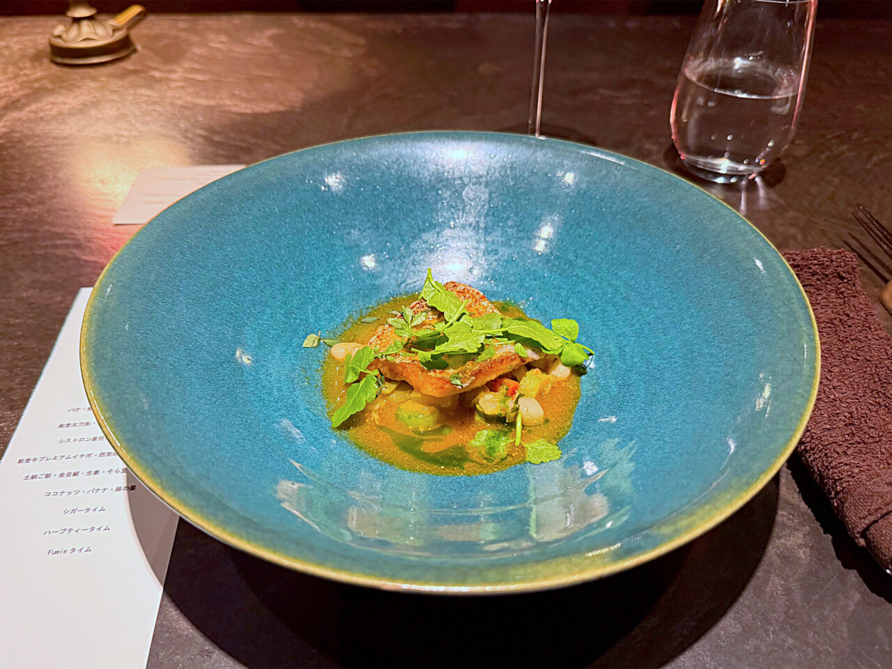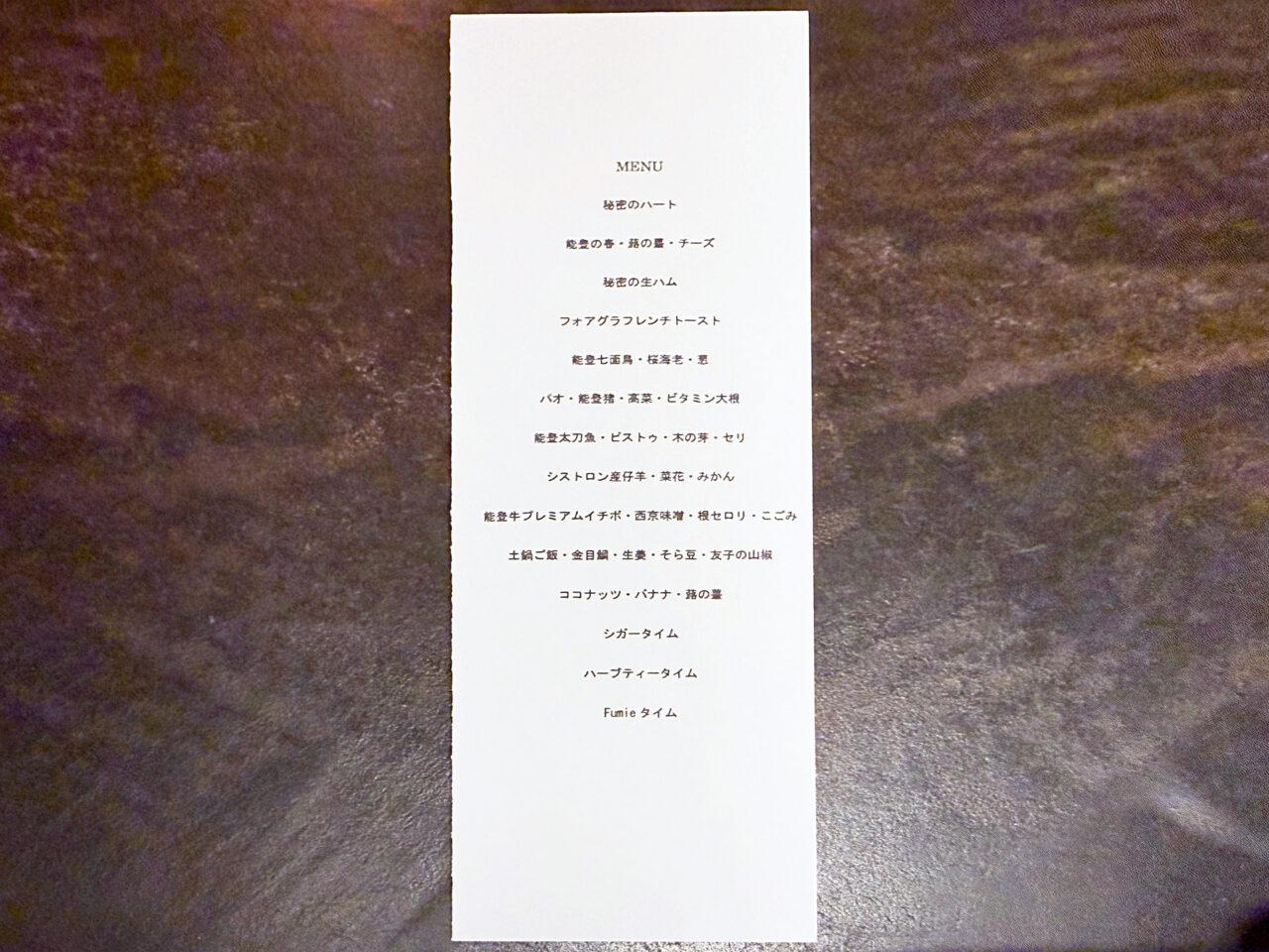 藪中シェフの出身地で有る石川県能登の食材をメインに、フレンチ、スパニッシュ、中華、和食と多彩なメニューです。