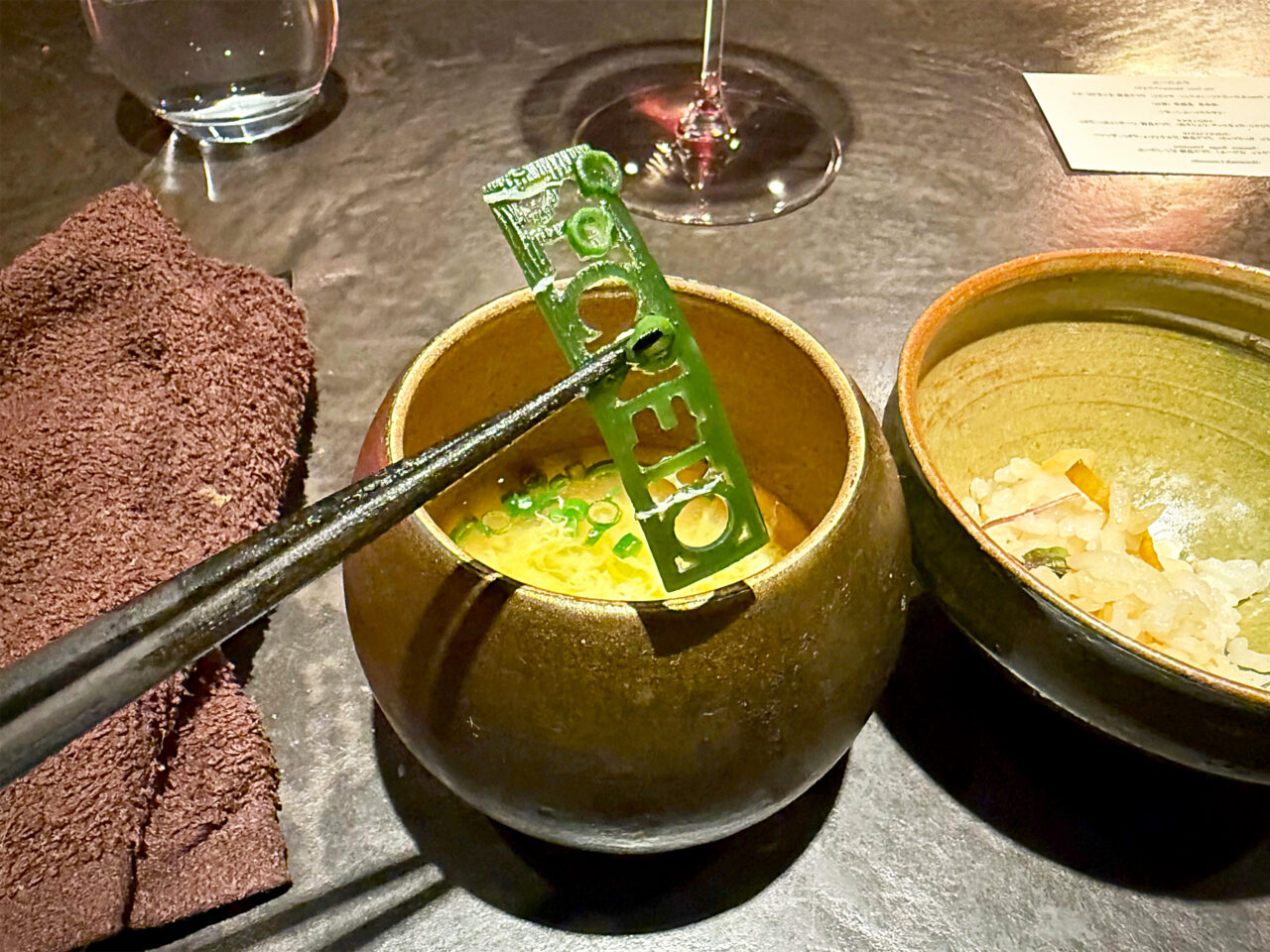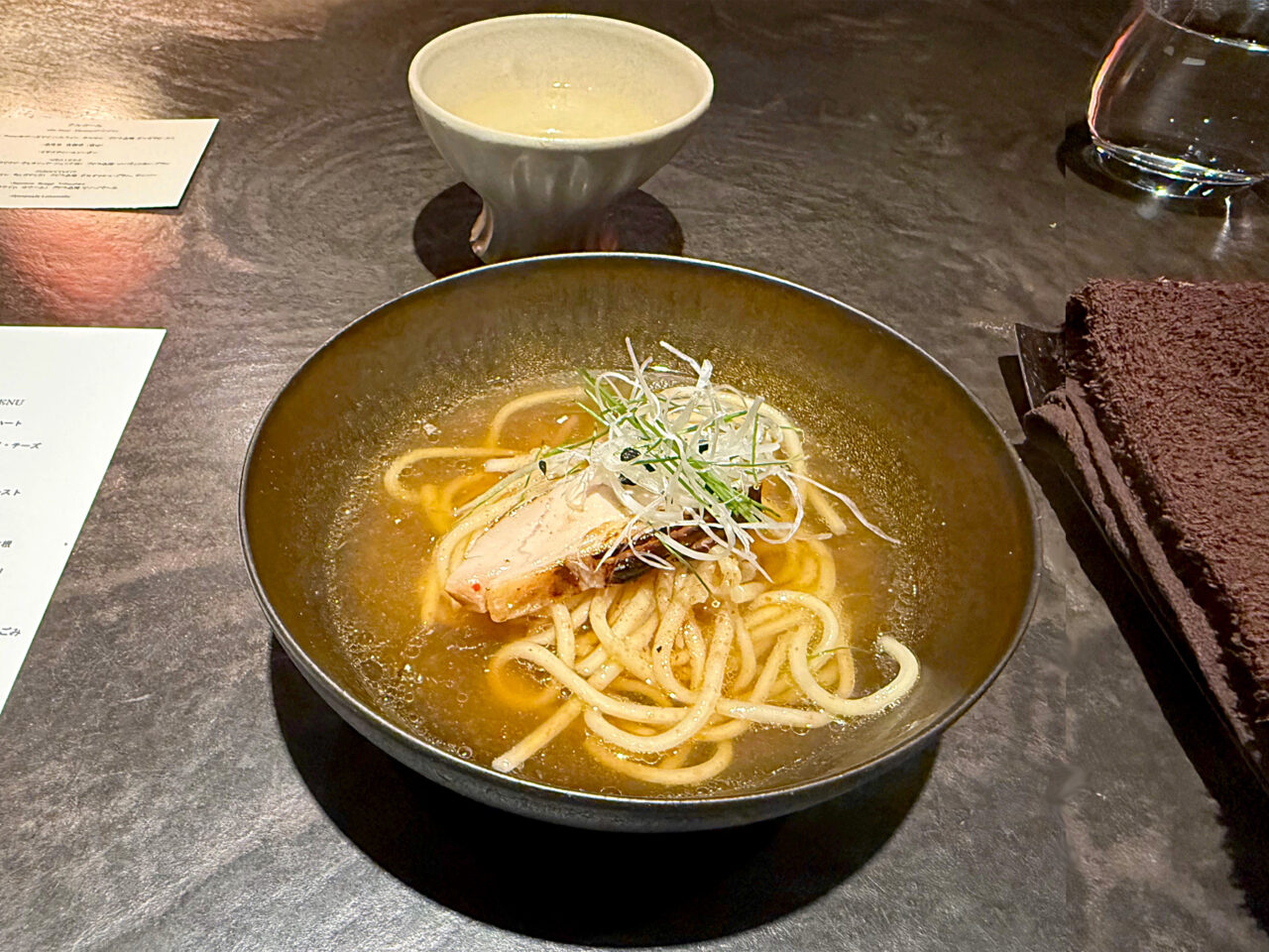 七面鳥のスープは鶏より脂が濃厚で、桜海老の香ばしさと麺の全粒粉の香ばしさ、そして白髪ネギの風味でバランスを取っています。