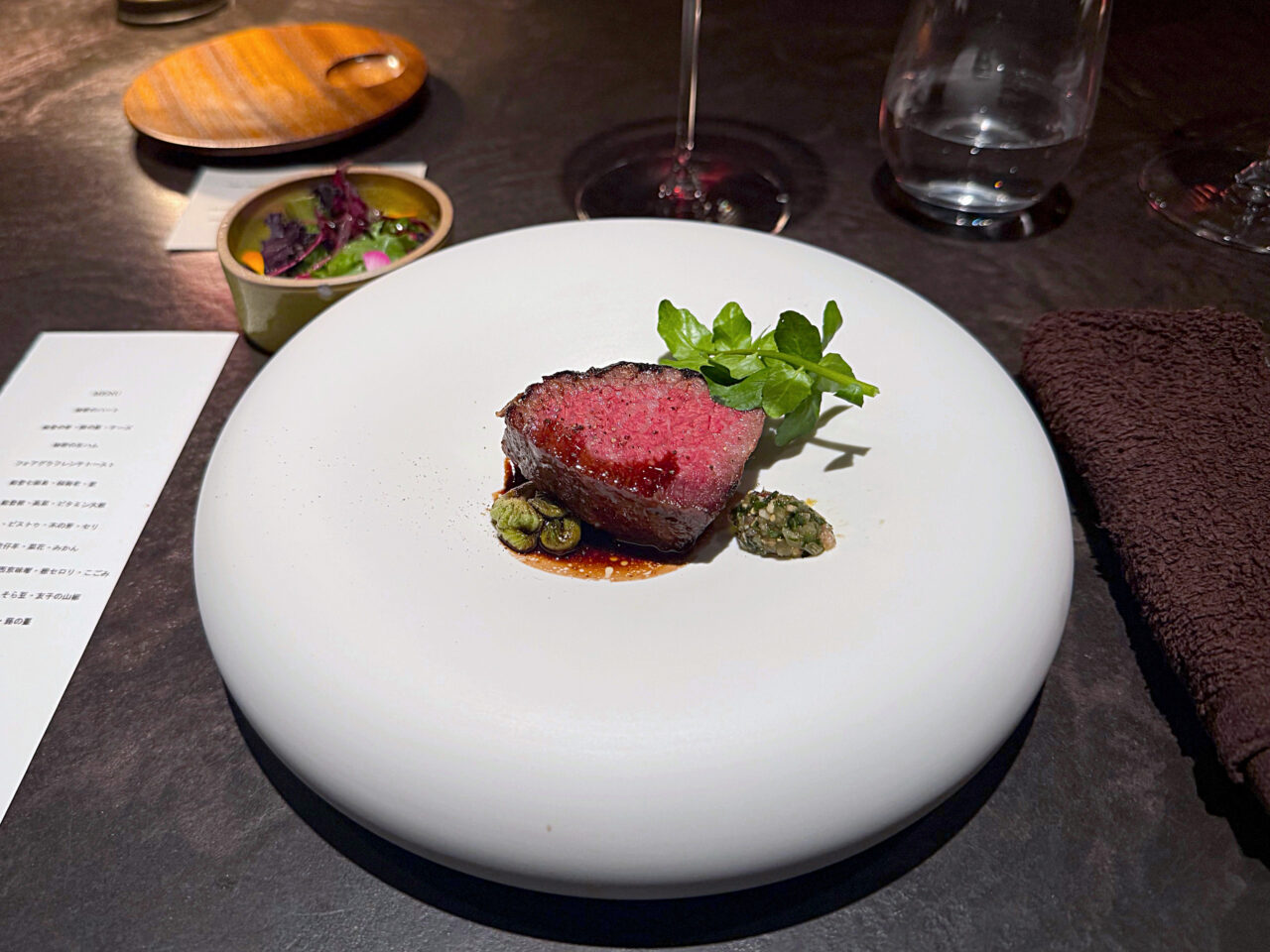 能登牛のイチボに西京味噌とこごみ、根セロリが添えられています。