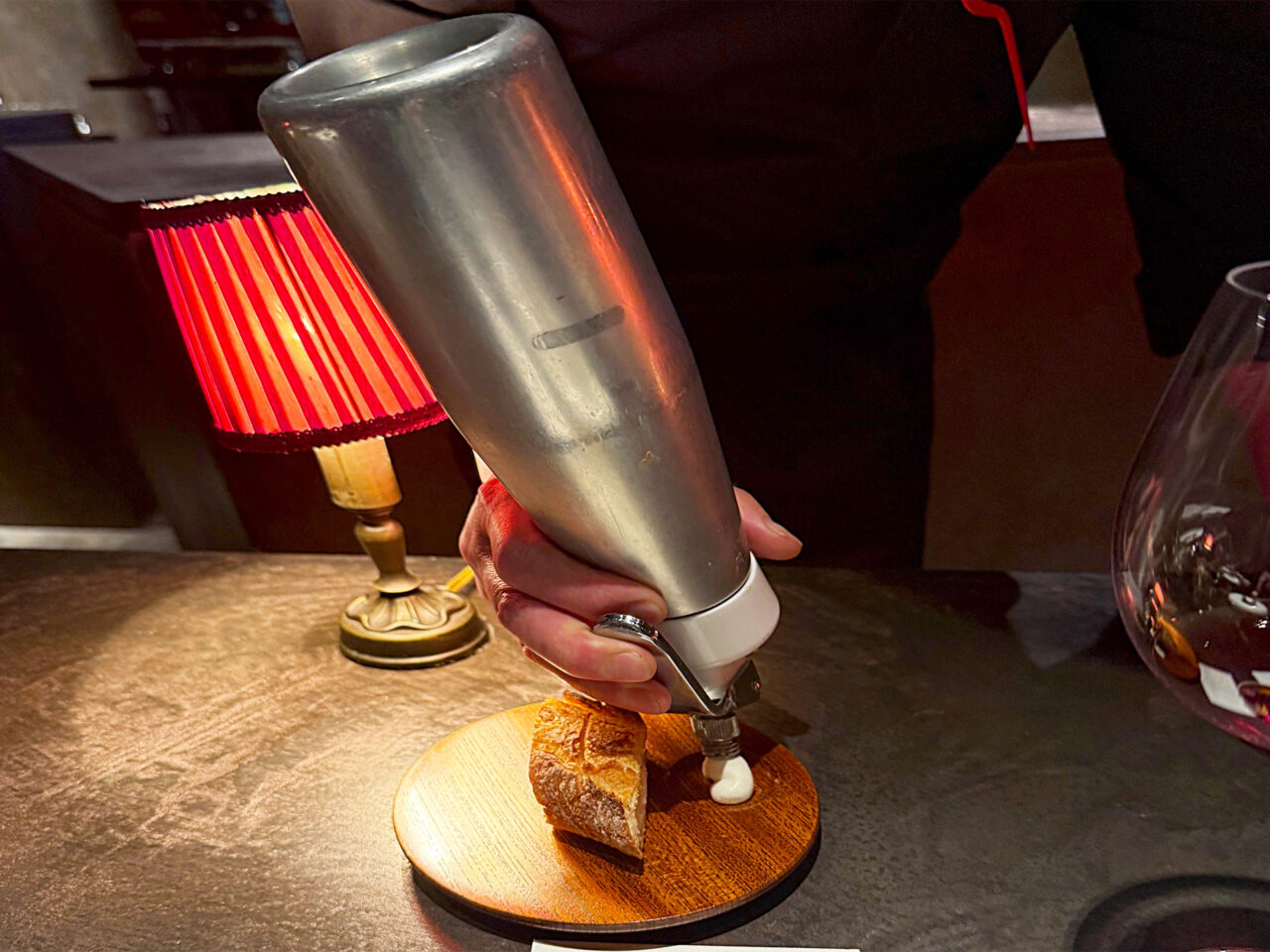 オレンジワインにバブルドームのコールドスモークを乗せていきます。