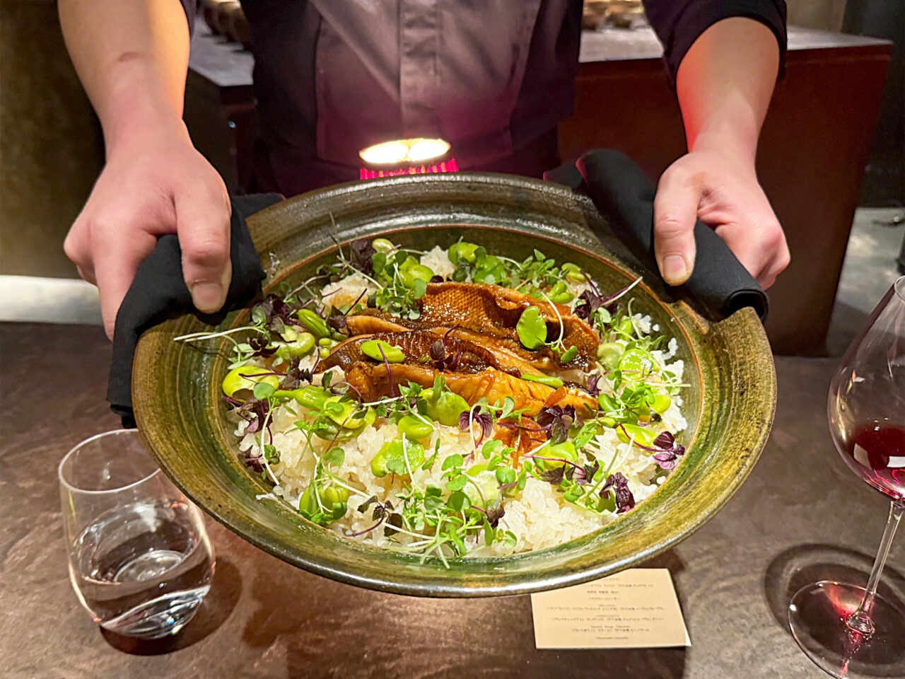 「土鍋ご飯・金目鯛・生姜・そら豆・友子の山椒」。